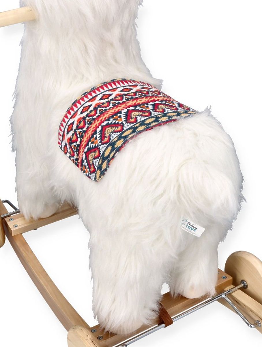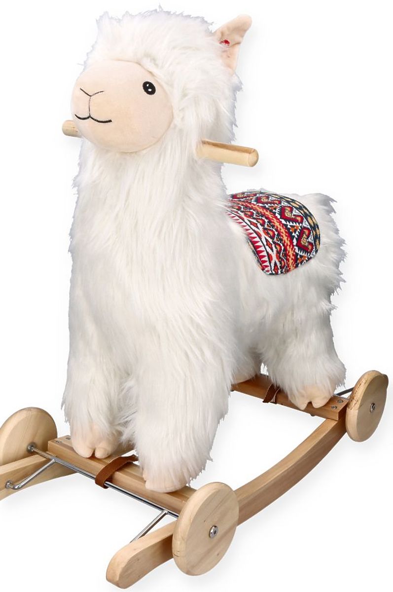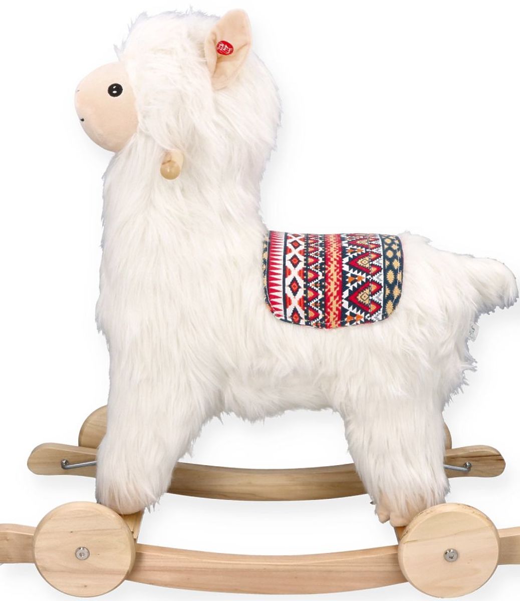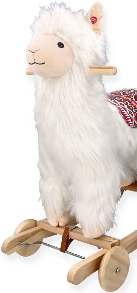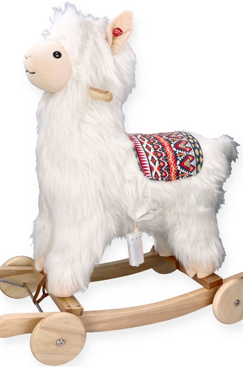 Questo nuovo design unico fa sì che la nostra alpaca si distingua tra altri prodotti simili. L'alpaca è realizzata in un materiale estremamente morbido e leggermente peloso per assomigliare a una vera alpaca. Con un viso allegro e una sella colorata con motivi peruviani, appare davvero eccezionale. In un orecchio c'è un pulsante che avvia una melodia. Inoltre, l'alpaca è dotata di ruote, quindi può essere utilizzata in due modi: per dondolare o per cavalcare.