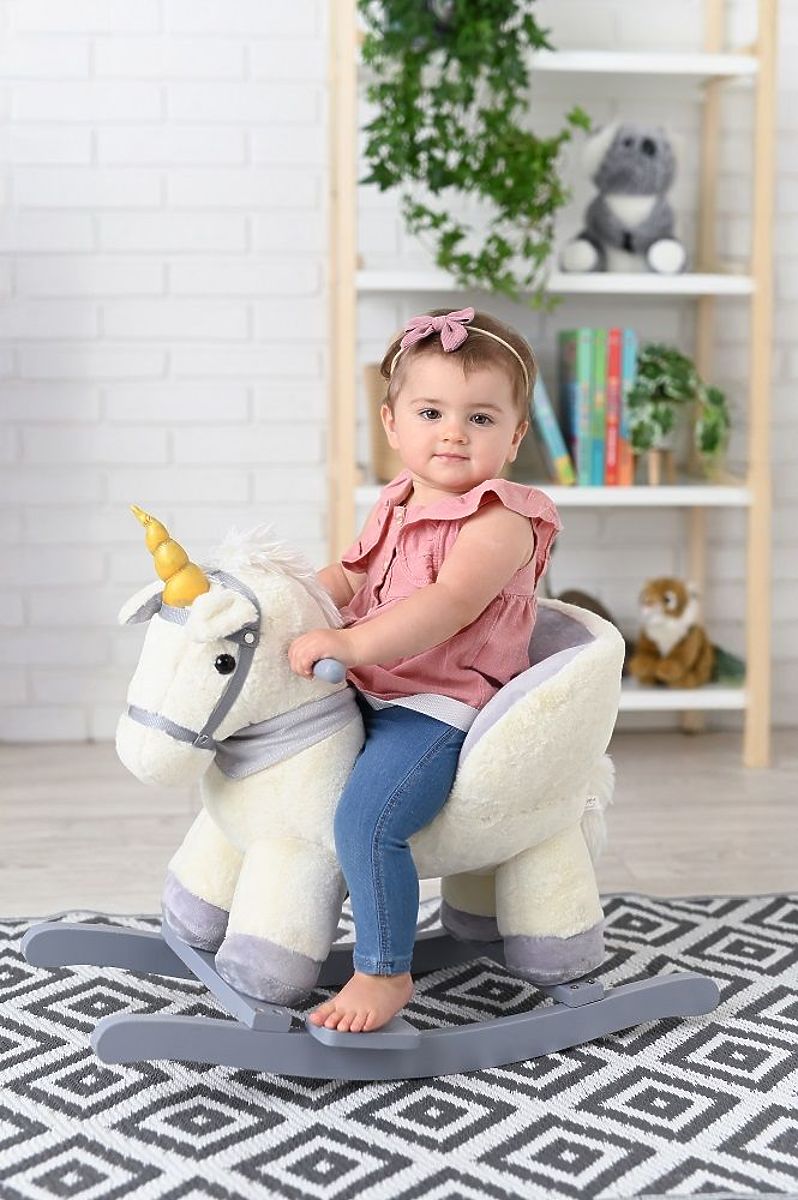 Il simpatico unicorno a dondolo non vede l'ora di incontrare il suo nuovo amico. Il tuo bambino si siederà comodamente nella poltroncina di peluche per intraprendere un lungo viaggio pieno di avventure con il suo dolce cavallino :)
