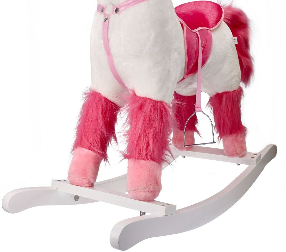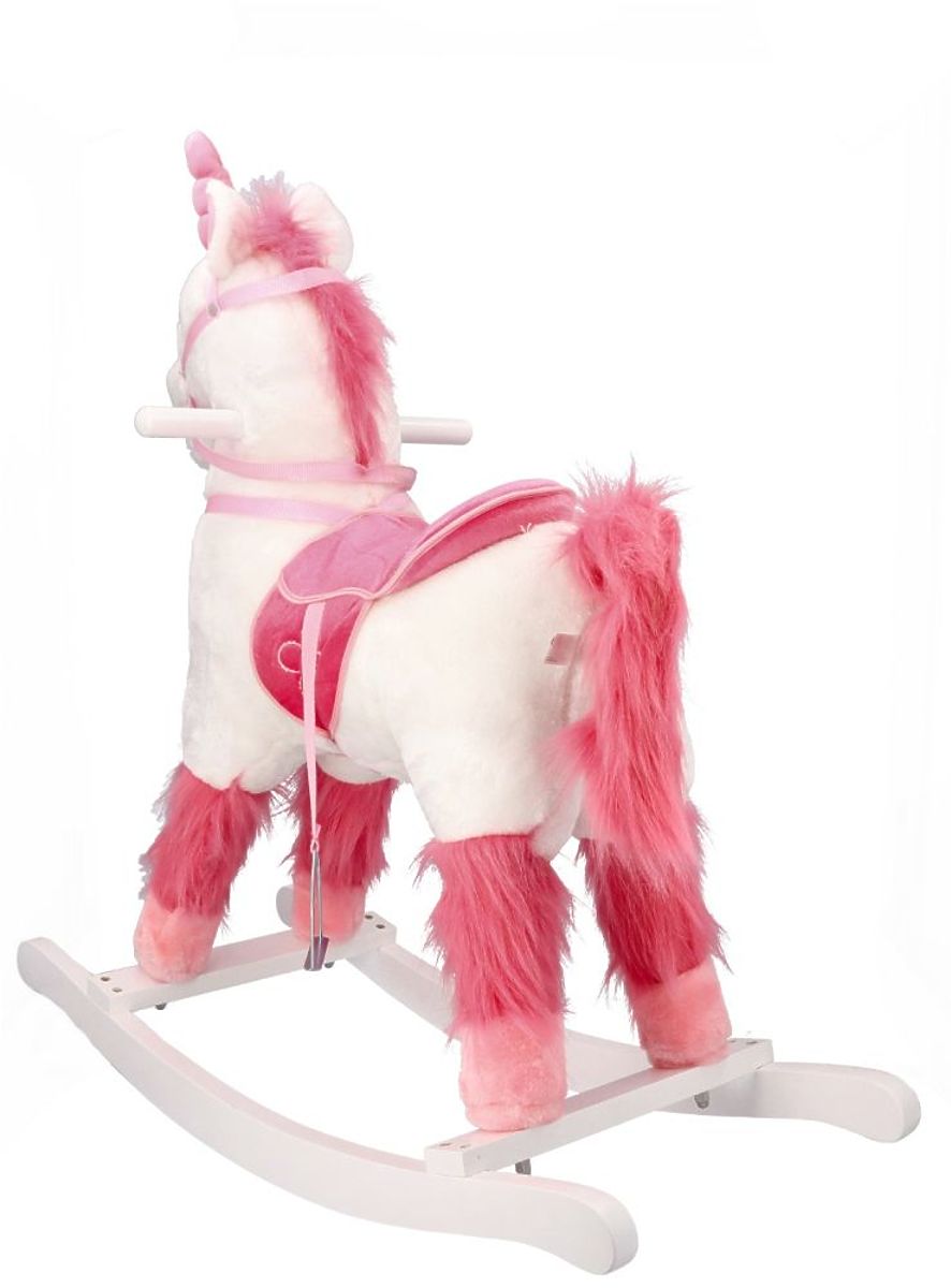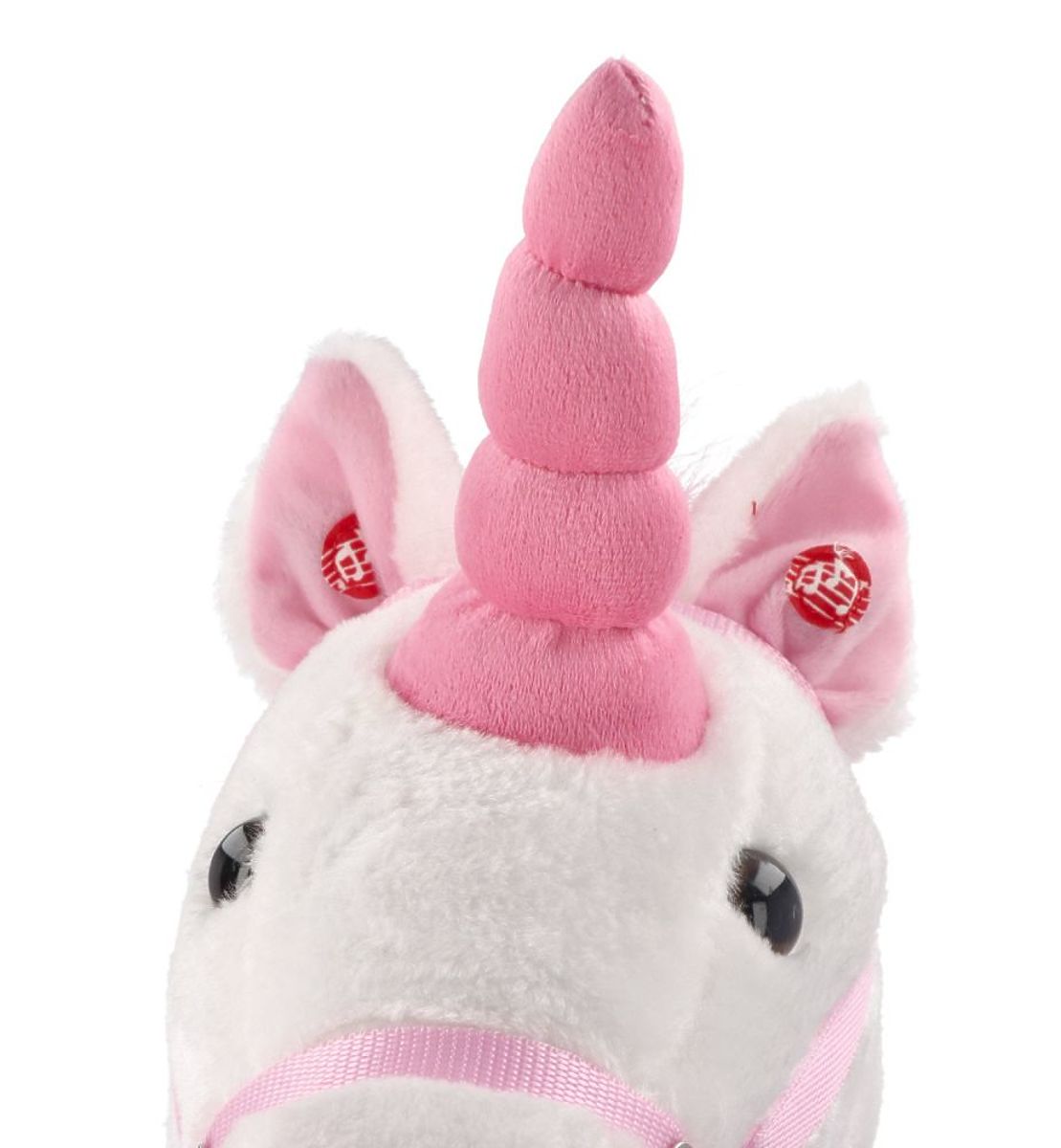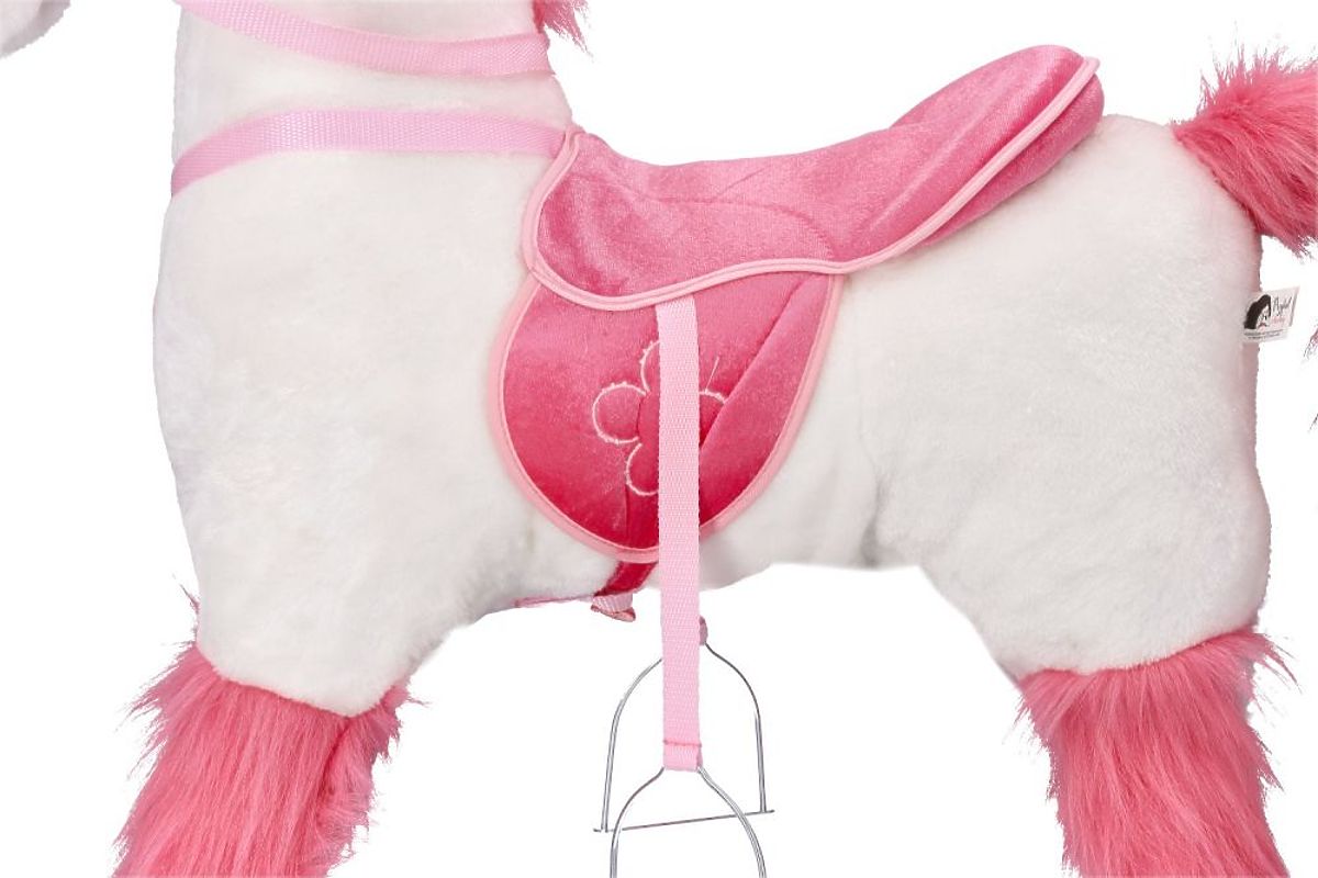 Il cavallo è realizzato in morbido materiale peluche di colore bianco. Ciò che gli conferisce fascino e carattere sono gli accessori rosa: corno, zoccoli, criniera, coda e bellissime nappe sulle gambe, tipiche ad esempio dei cavalli frisoni e ovviamente degli unicorni;-) Anche gli elementi dell'attrezzatura da equitazione, cioè sella e briglie, sono rosa. Il cavallo ha pattini e maniglie in legno bianco.
