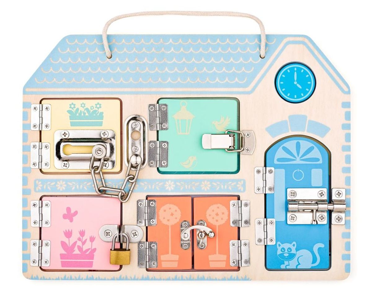 Piccole mani, grandi aperture! Cinque diversi tipi di serrature e segreti dietro ogni porticina – tutto ciò favorisce la concentrazione, la pazienza e l'apprendimento giocoso. Questa lavagna educativa combina abilità motorie e pensiero logico.