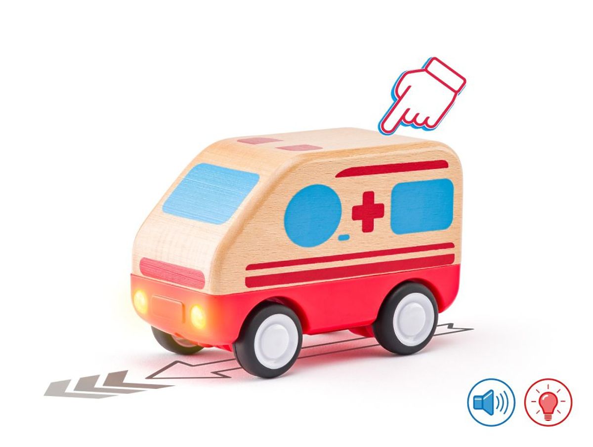 La nuova collezione di veicoli del marchio Woody sono macchinine adattate alle piccole mani. Sono realizzate in legno con elementi in plastica, dipinte con colori sicuri per i bambini. Hanno pneumatici in gomma morbida, che garantiscono una buona aderenza alla superficie. Premendo la macchinina, si accendono le luci, si sente il segnale e il veicolo inizia a muoversi. La confezione include 3 batterie LR44 1,5 V.
