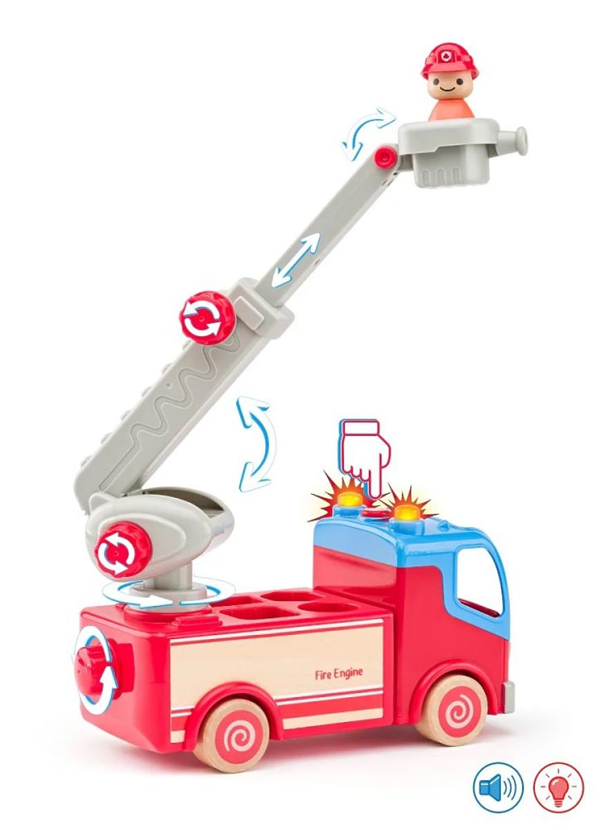 L'autopompa è realizzata in una combinazione di plastica e legno di alta qualità e include molte attrezzature di soccorso, comprese 2 figurine di pompieri. Ha una scala girevole estensibile con piattaforma e premendo un pulsante nella cabina del conducente si attivano luce e suono. Il veicolo ha una corda per tirare il giocattolo.