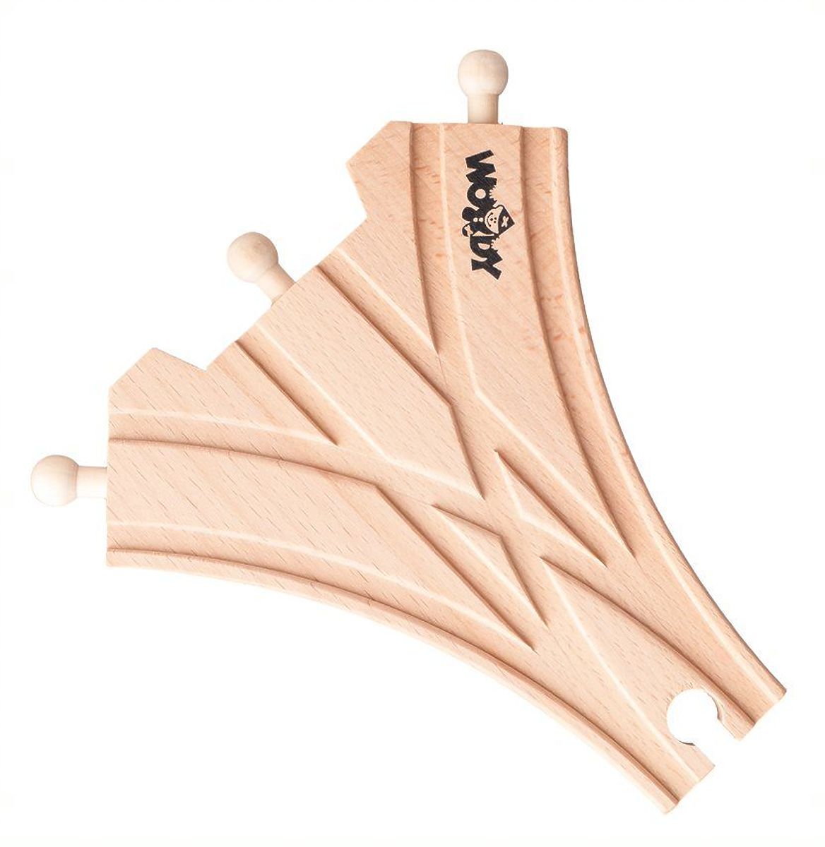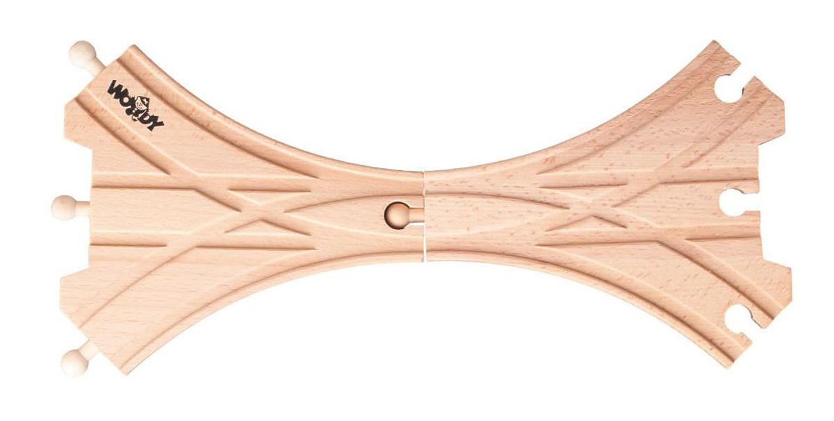 Due elementi in legno, una volta uniti, formano un grande scambio a forma di lettera "X". È un'altra interessante proposta per espandere i vostri set ferroviari. È adatto per creare incroci e collega fino a tre binari su ciascun lato dello scambio. Proprio questi scambi e connessioni rendono il gioco con i trenini così avvincente. Grazie alle diverse parti, i vostri binari saranno sempre diversi e i bambini avranno la possibilità di creare nuove combinazioni ogni volta. Con due parti, potete creare un grande scambio a forma di X o collegare gli scambi ai binari in modo diverso, ciascuno separatamente.