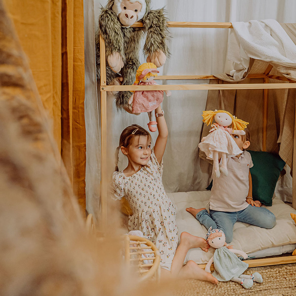 La bambola di stoffa Suzette è spesso sognante e ama immergersi nei meravigliosi racconti. Ama indossare bei vestiti rosa fluenti in cotone decorati con ricami floreali, ballerine rosa, una fascia con un grande fiocco con un tocco di tulle. Gli abiti possono essere tolti e rimessi. La bambola è fornita in una confezione regalo originale. Il giocattolo soddisfa le norme di sicurezza CE europee. Manutenzione: Lavare a 30° Consiglio: Asciugatura naturale o a bassa temperatura. Caratteristiche principali: adatto dalla nascita, viso in cotone, occhi e bocca ricamati e lentiggini, bambola con accessori che possono essere tolti e rimessi, in confezione regalo