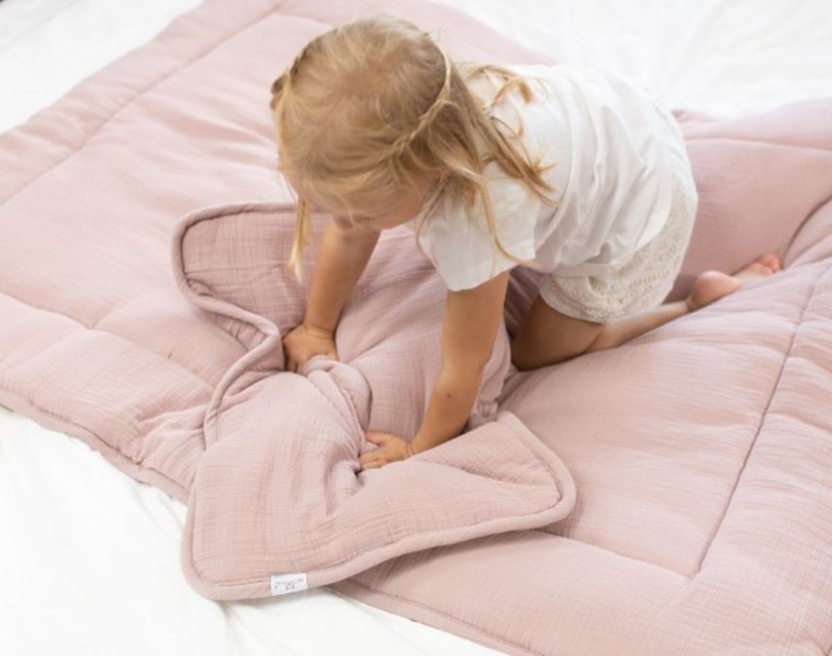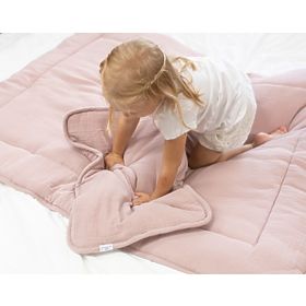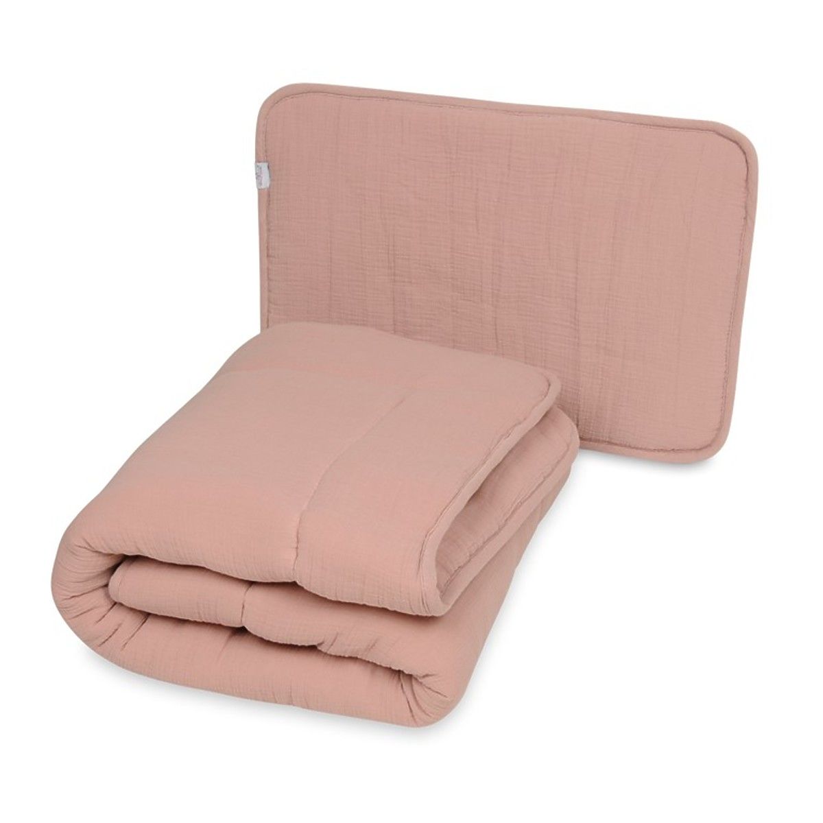 Set composto da coperta e cuscino in mussola con imbottitura in un bellissimo colore rosa. Il doppio strato di cotone garantisce un sonno morbido e confortevole al tuo bambino.