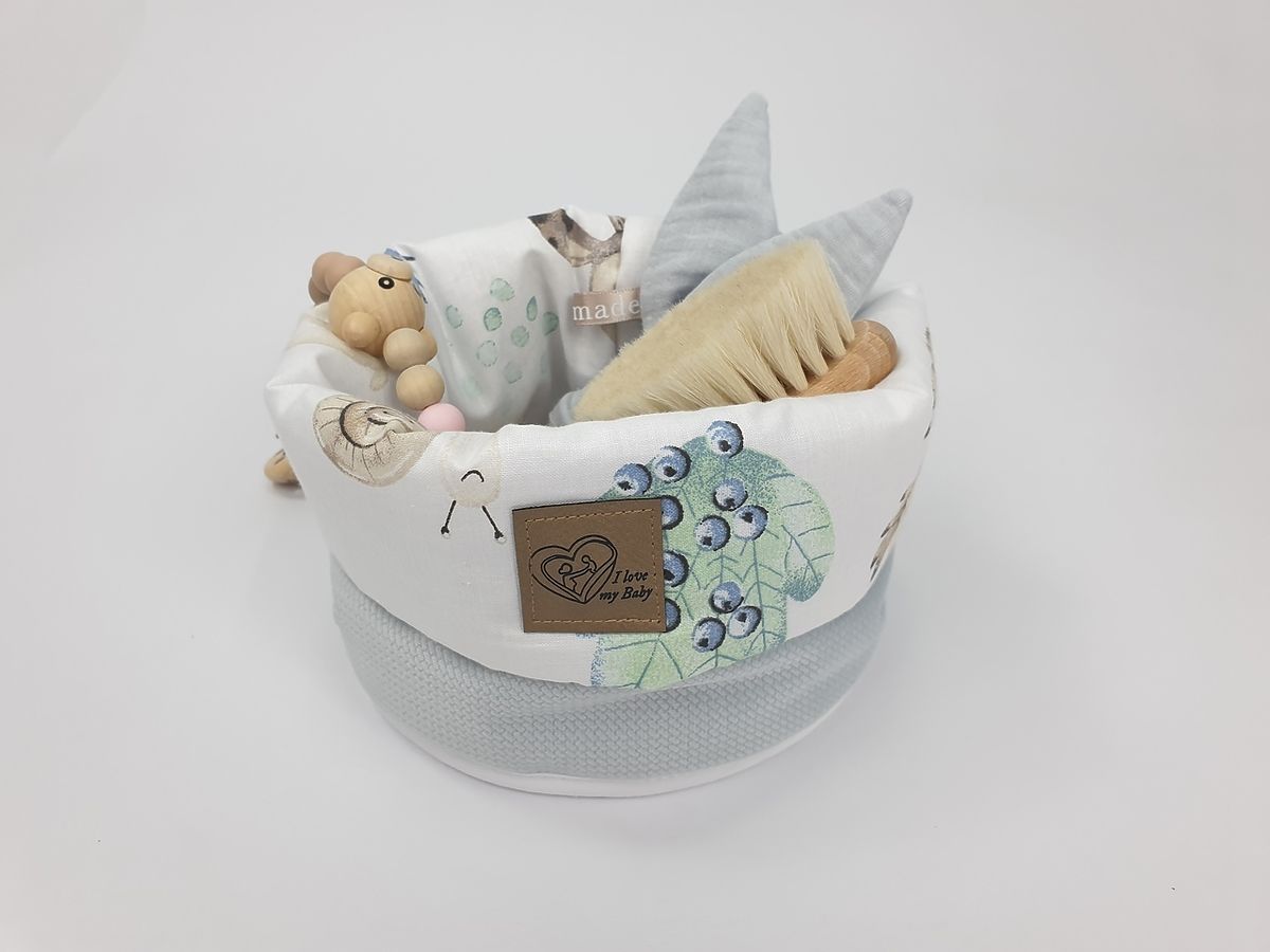 Cestino in tessuto a doppia faccia per pannolini, cosmetici e altri articoli per bambini. Un cesto di stoffa con il motivo di un riccio e dei suoi amici sarà anche una bella decorazione per la cameretta dei bambini.