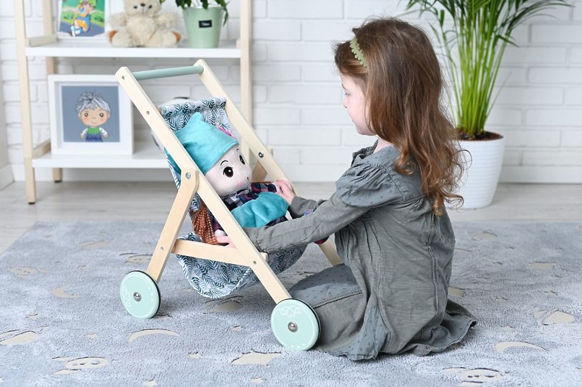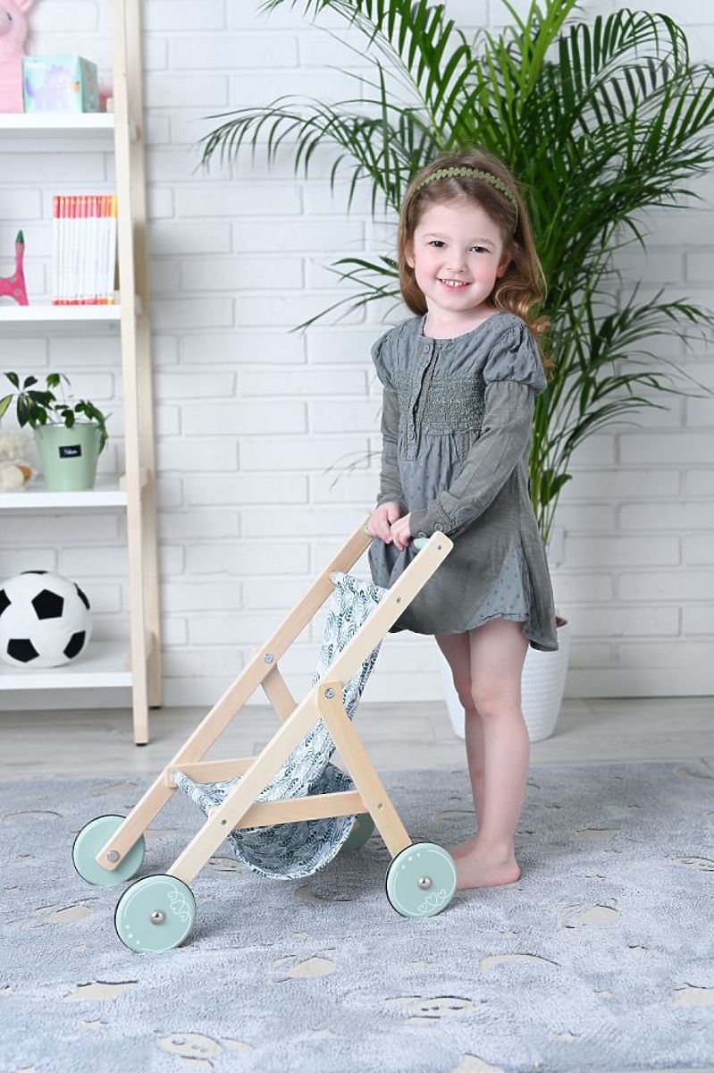 Il leggero passeggino in legno per bambole è una nuova proposta di AdamToys per le passeggiate estive di un bambino con le sue bambole preferite. D'ora in poi, le passeggiate diventeranno un'attrazione straordinaria grazie all'aspetto adorabile del passeggino e alla sua struttura leggera. Il passeggino si spinge molto facilmente grazie alle grandi ruote con fasce antiscivolo in gomma e al peso ridotto. Il passeggino è realizzato in legno con accenti menta sulle ruote e sul manico. La bambola o l'orsacchiotto può essere sistemato sul sedile con bellissimi ramoscelli verdi. L'aspetto complessivo è molto grazioso e sicuramente attirerà molti sguardi sulla passeggiata e al parco giochi.