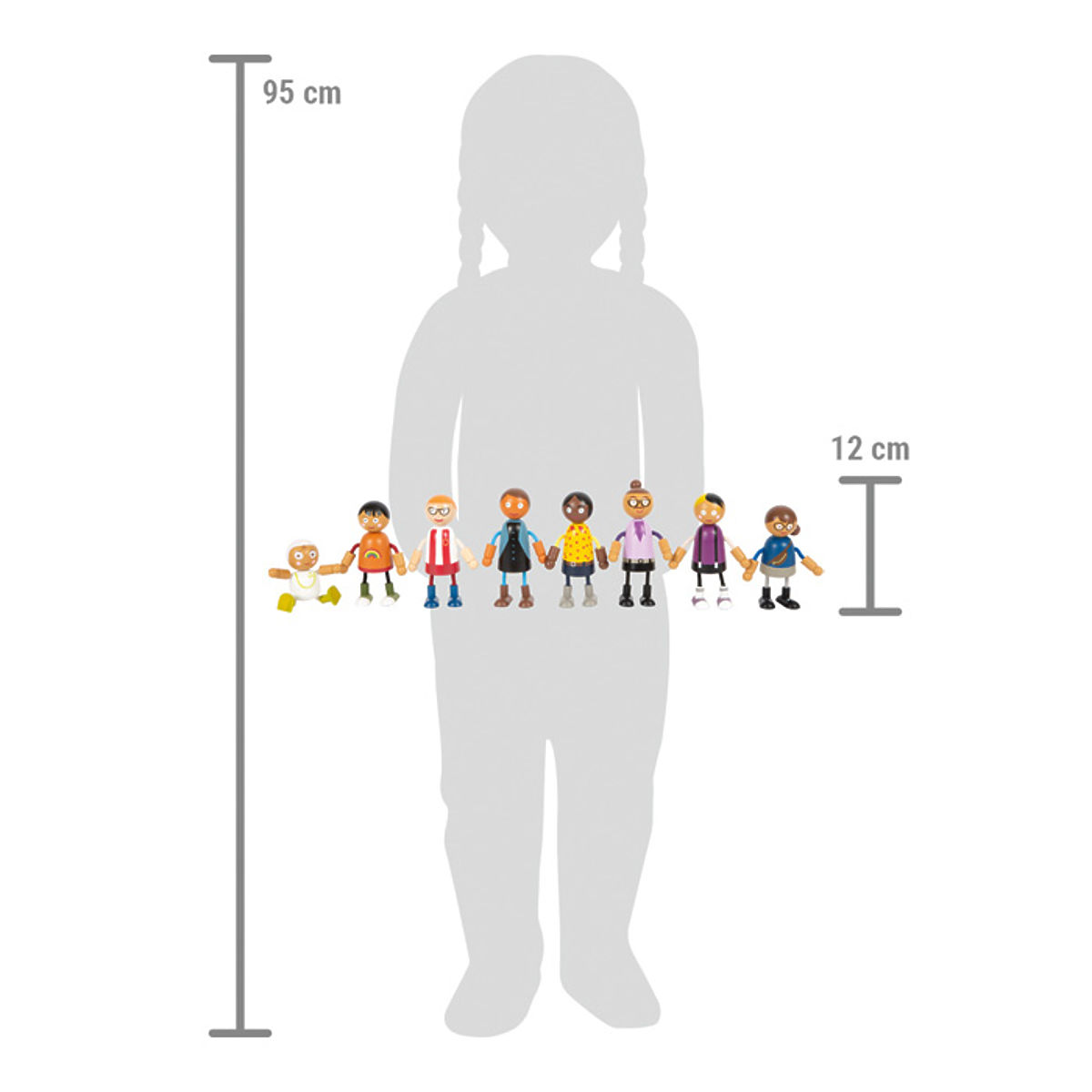 Questa grande famiglia di bambole flessibili in legno è adatta per ogni casa delle bambole. È composta da 8 membri della famiglia di sesso ed età diversi. Le bambole flessibili hanno la testa e il corpo realizzati in legno massiccio, mentre le loro braccia e gambe sono in tessuto, flessibili. Due coppie di genitori, tre bambini e un neonato nel marsupio, che può essere attaccato alle altre bambole flessibili, offrono molteplici possibilità di gioco. Il gioco di ruolo attivo insegna ai bambini in modo divertente quanto possa essere vario lo stile di vita. Il gioco di ruolo favorisce lo sviluppo dell'identificazione, della comunicazione, dell'immaginazione e delle abilità sociali ed emotive. Le bambole flessibili sono facili da afferrare per le piccole mani dei bambini. Accessorio ideale per la villa cittadina con casa delle bambole (11802) e la villa cittadina compatta (12277). Caratteristiche principali: famiglia di bambole flessibili composta da 8 membri che stimola l'immaginazione, la creatività e le abilità sociali; divertimento realistico grazie alle braccia e gambe flessibili; flessibili, robuste e ricche di dettagli; dimensione delle figure facilmente afferrabile per le mani dei bambini.