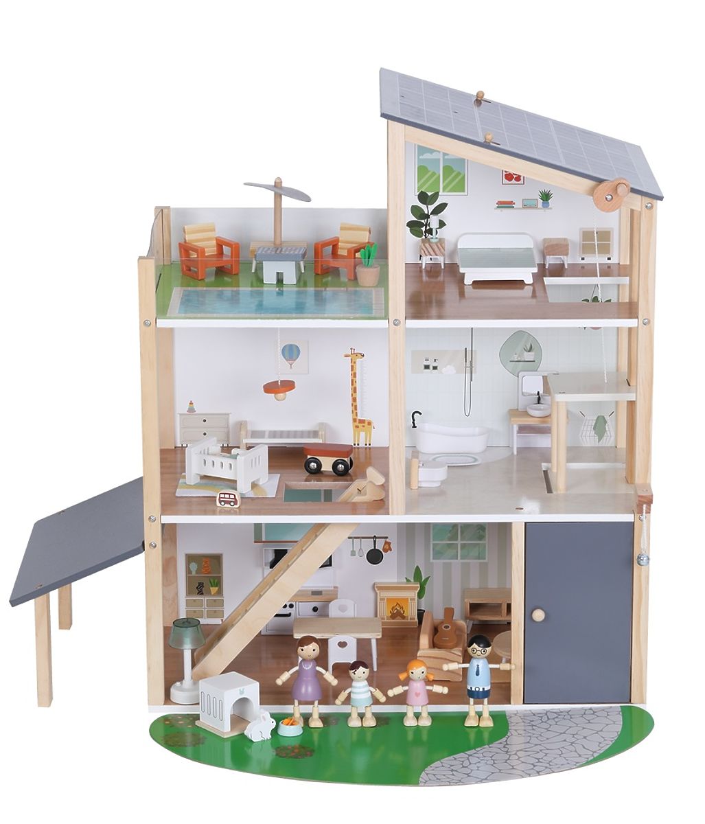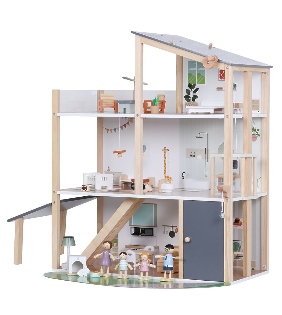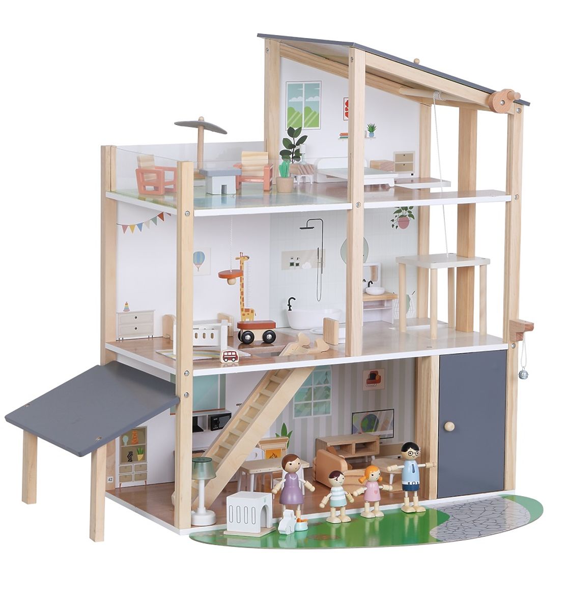 Benvenuti nella casa dove vivere è una gioia! La spaziosa casa in legno è completamente arredata con mobili e accessori. Troverete una cucina spaziosa collegata a un accogliente soggiorno, un elegante bagno con vasca, una cameretta per bambini, una camera da letto e una lussuosa terrazza sul tetto per momenti di relax. E per non farci mancare nulla, c'è anche un ascensore. Girate la manovella e portate la famiglia fino al secondo piano. Il set include un adorabile animale domestico, un coniglietto con la sua casetta, e una famiglia di quattro persone pronta a stabilirsi e iniziare a scrivere la propria storia. I bambini sviluppano la fantasia, le abilità sociali e il senso del dettaglio durante il gioco. E soprattutto si divertono un mondo! Il design giocoso, i colori delicati insieme alla qualità della realizzazione fanno di questo giocattolo un bellissimo complemento per ogni cameretta o sala giochi. La casa viene fornita smontata e richiede montaggio. Le istruzioni per l'assemblaggio sono incluse nella confezione. Caratteristiche principali: 41 pezzi, casa in legno completamente arredata con 4 figure familiari, supporta la fantasia, la creatività e il gioco di ruolo, stimola il gioco immaginativo, lavorazione di qualità e design attraente, fornito smontato, montaggio richiesto, istruzioni per l'assemblaggio incluse, adatto per bambini dai 3 anni in su.