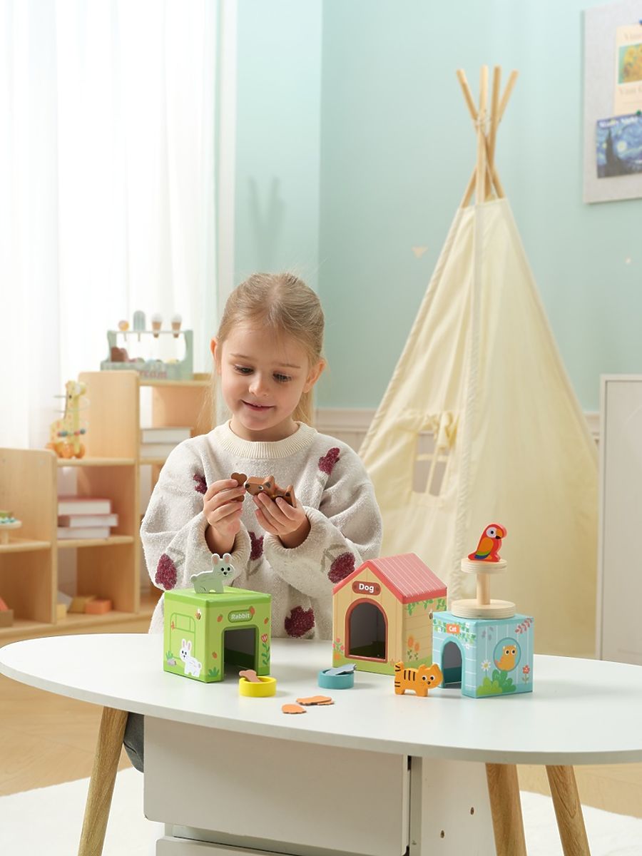 Divertiti un mondo con i tuoi animali domestici in legno! Cane, gatto e coniglietto hanno ciascuno la propria casetta e cibo, e un pappagallo li osserva dal .. altro