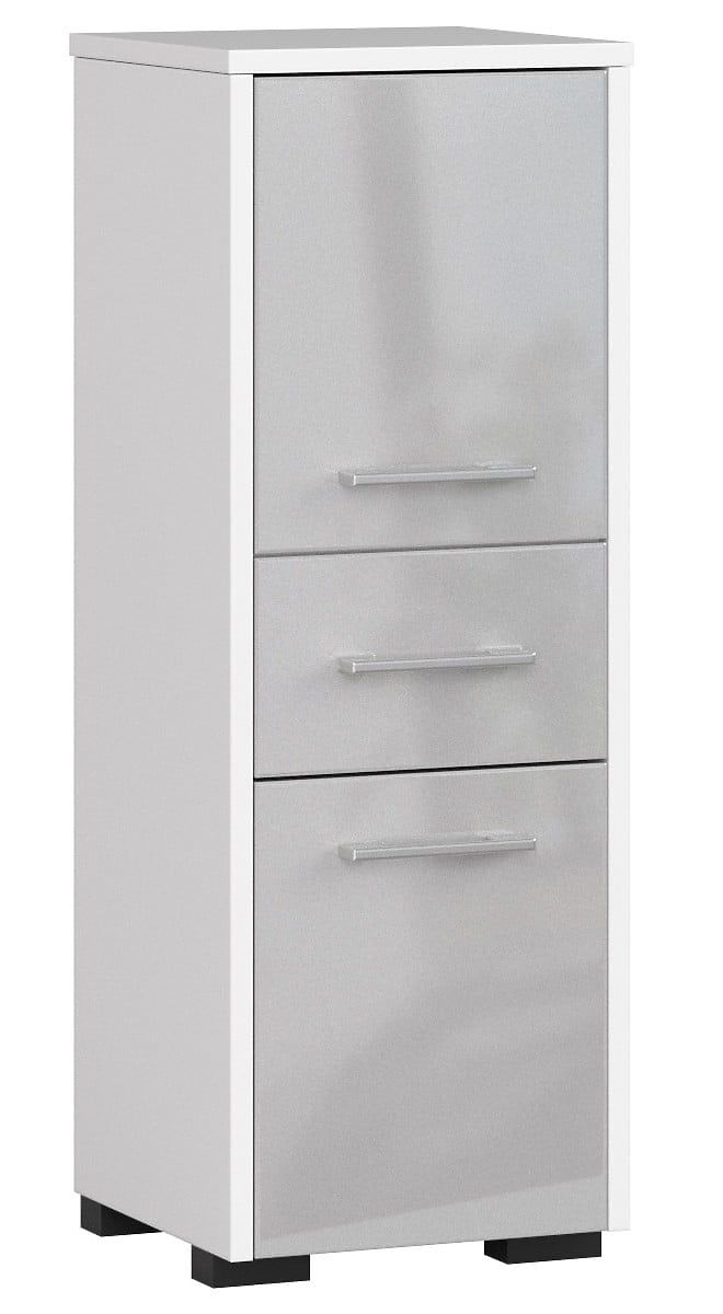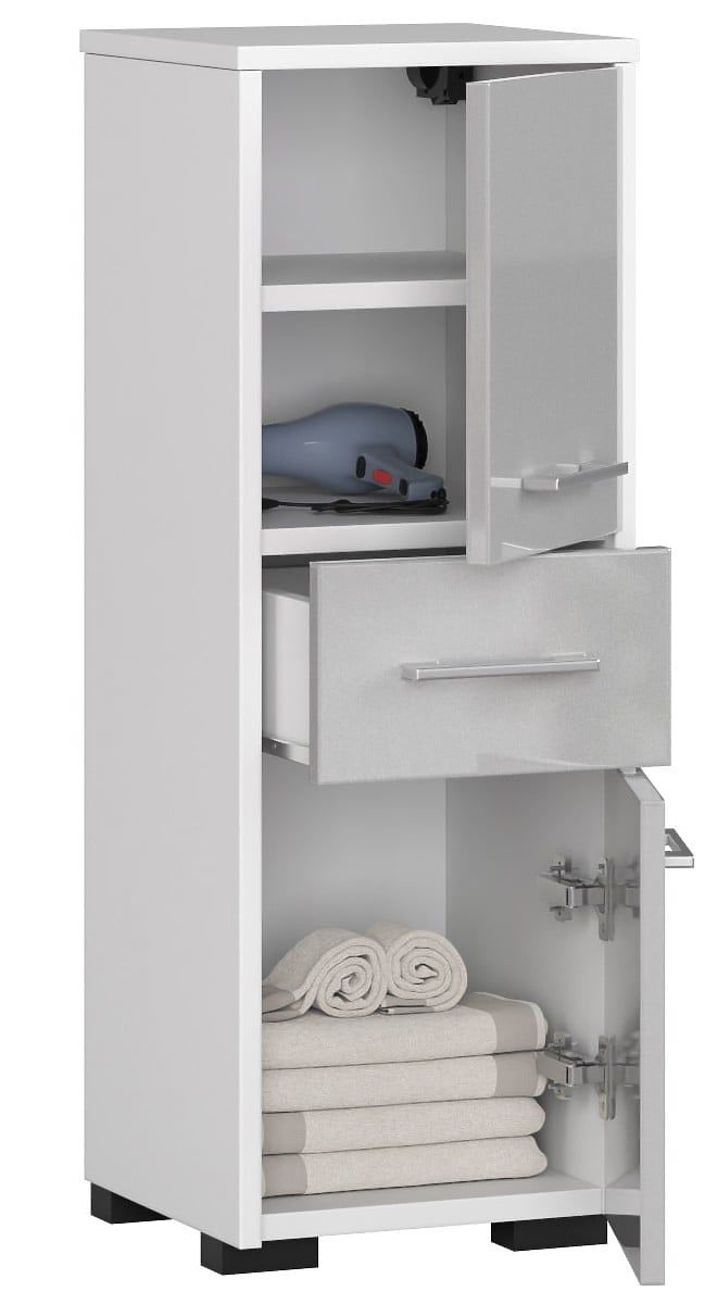 La colonna da bagno FIN con cassetto e due ante a ribalta è realizzata in pannello laminato per mobili di alta qualità e resistente all'abrasione Kronospan. Il corpo bianco del mobile si abbina perfettamente ai frontali con superficie acrilica ad alta lucentezza in colore metallico. Sotto il piano della colonna è posizionato un armadietto con due ripiani e ante. Più in basso si trova un cassetto e sotto di esso un altro armadietto – questa volta con un solo ripiano. L'elegante armadietto da bagno è completato da maniglie interessanti, comode e semplici.