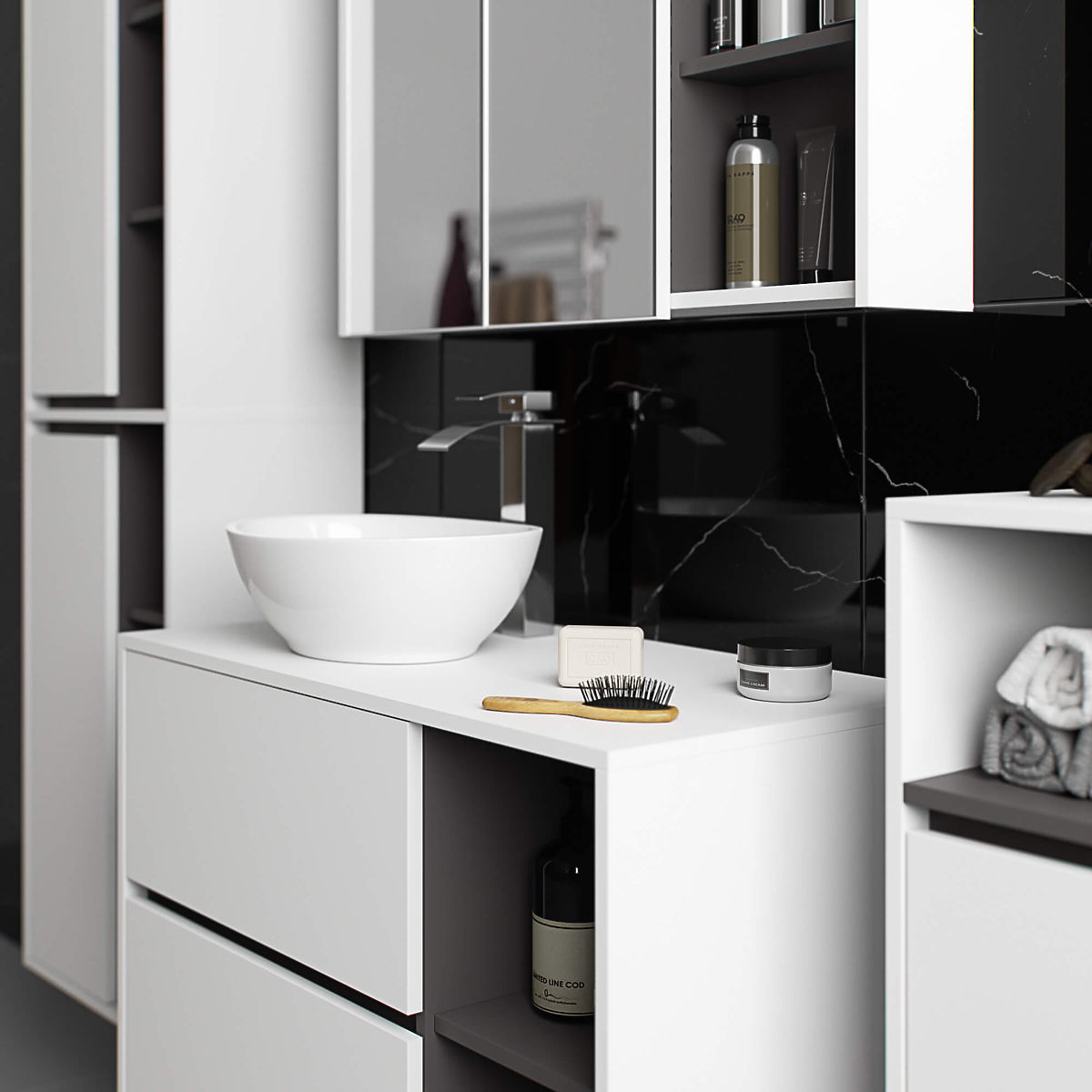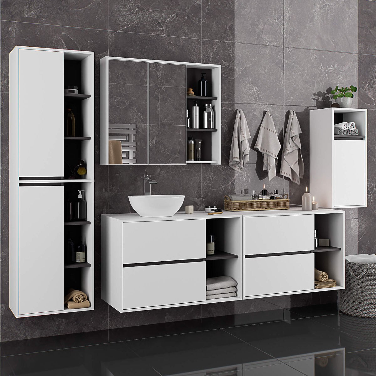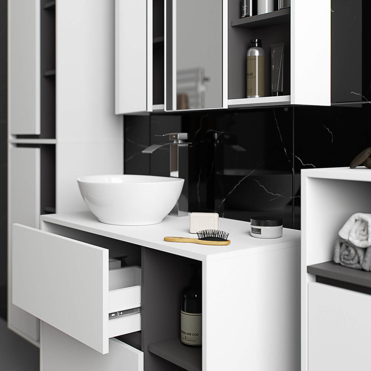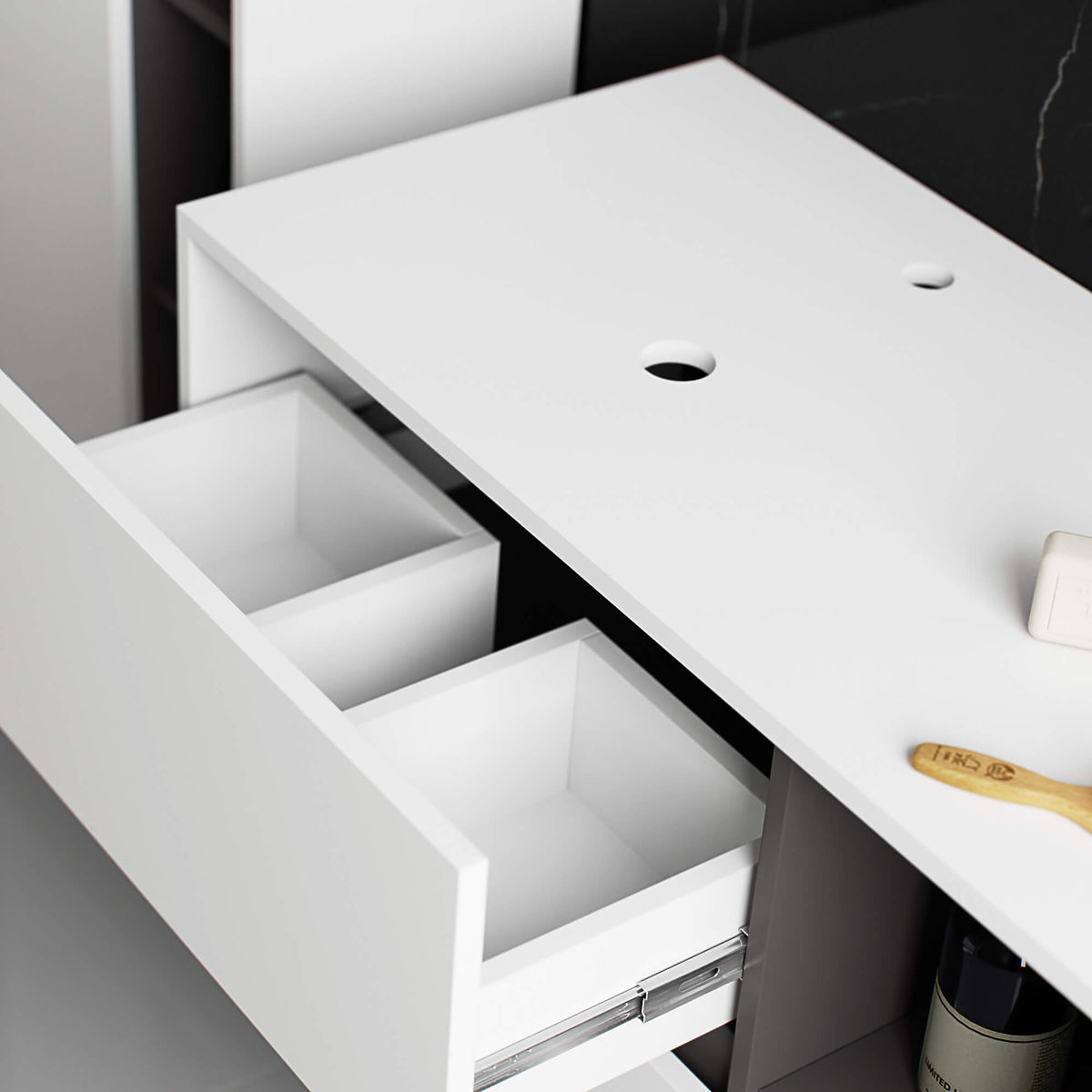 Armadio sospeso da bagno sotto lavabo 90 cm VAMI W90 si abbina perfettamente a un interno moderno. La configurazione con 2 cassetti e 2 ripiani aperti offre grande comodità d'uso. Nei cassetti spaziosi si possono riporre prodotti igienici e cosmetici, mentre sui ripiani aperti si possono posizionare decorazioni che donano carattere all'interno. Il modello descritto di armadio sospeso sotto lavabo ha 2 fori nel piano destinati all'installazione del lavabo e del sifone. L'armadio ha anche cassetti appositamente sagomati che consentono l'installazione del sifone e degli elementi idraulici. ATTENZIONE! Il mobile viene fornito senza lavabo e rubinetteria.