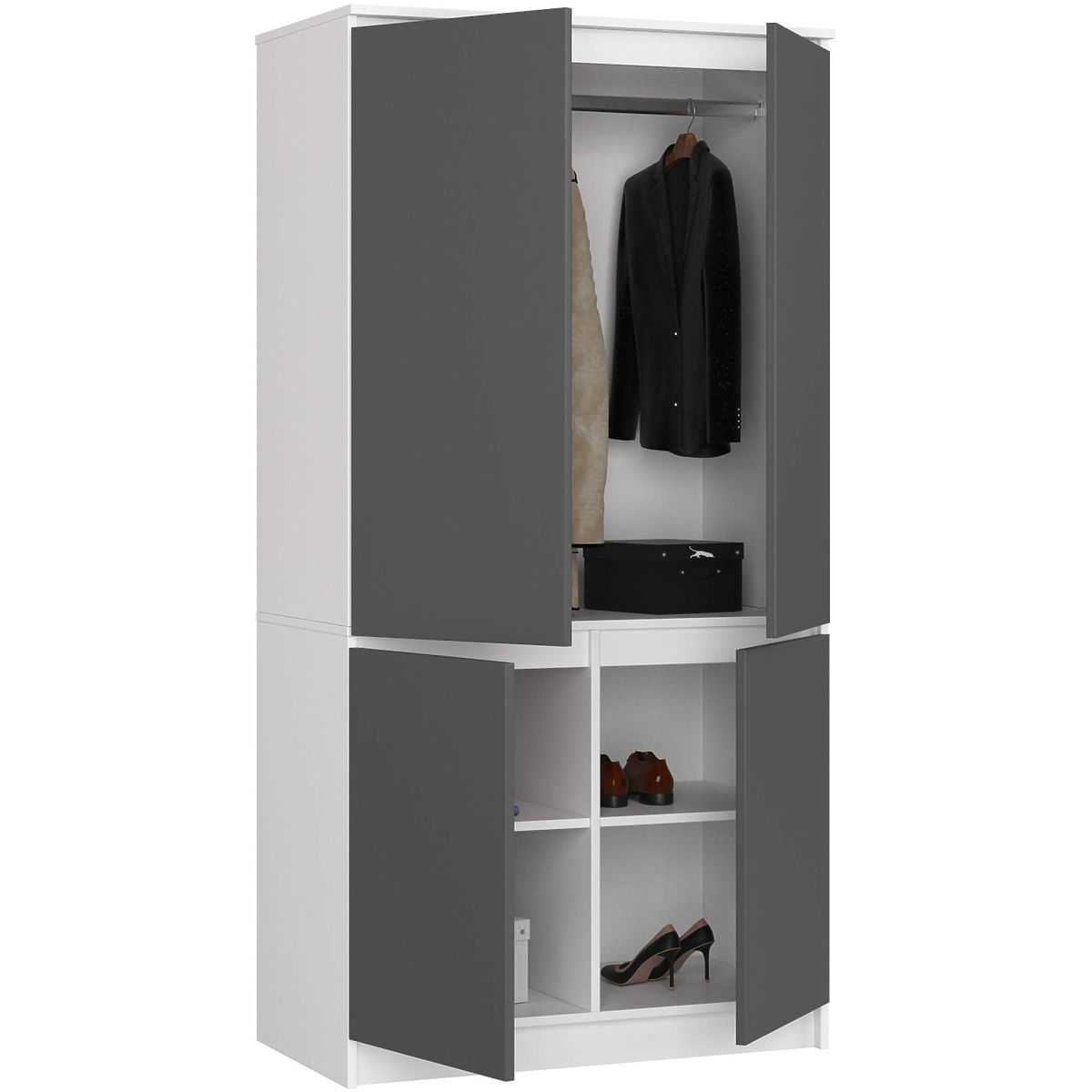 L'armadio a quattro ante è un mobile universale e pratico che completa perfettamente l'arredamento di camere da letto, ingressi o soggiorni in interni studio. L'elegante design e la colorazione bianco grigio grafite rendono l'armadio ideale per arredamenti sia classici che moderni. L'armadio è dotato di ampi ripiani, ideali per riporre capi di abbigliamento o fodere di ricambio per coperte e cuscini, lenzuola, tovaglie o coperte. Nella parte del mobile situata dietro le porte a ribalta si trova un'asta per appendere. I ripiani possono essere utilizzati per maglioni, camicette, borse, ma anche per esempio per asciugamani. Al contrario, l'asta è perfetta come spazio per appendere abiti, vestiti, gonne e capispalla come cappotti o giacche. Il mobile si distingue per la lavorazione accurata in pannello laminato di alta qualità, resistente all'abrasione. I bordi dell'armadio sono stati rifiniti con un'estetica bordatura in ABS.