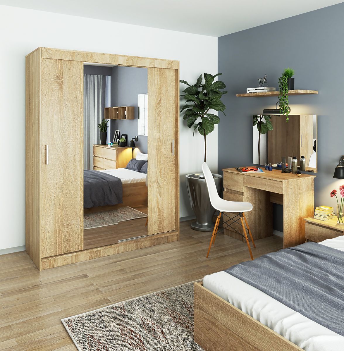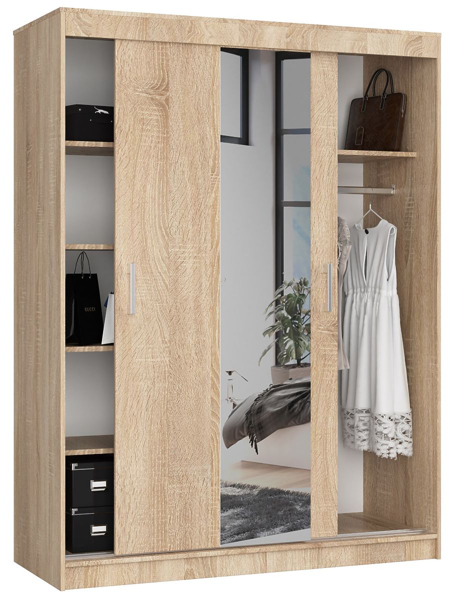 L'armadio scorrevole con specchio posizionato nella parte centrale del mobile è realizzato in pannello laminato Kronospan di alta qualità, resistente all'usura. Sia il corpo del mobile che parzialmente ciascuna delle 2 ante che scorrono su guide metalliche, sono mantenuti nella calda tonalità del rovere sonoma. L'interno dell'armadio è funzionalmente diviso in 2 parti. Sul lato sinistro sono posizionati spaziosi ripiani (5 pezzi) uno sopra l'altro. La parte destra dell'armadio è costituita da uno spazio per appendere i vestiti. È installato un ripiano superiore, sotto il quale è fissata un'asta metallica.