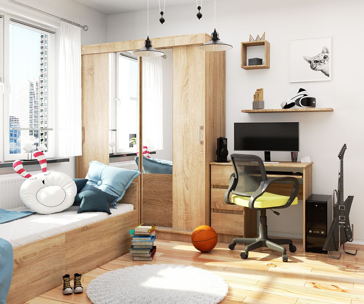 Spazioso armadio in colore rovere sonoma, con porte scorrevoli e specchio, è un mobile universale e senza tempo che svolgerà la sua funzione in quasi ogni stanza abitativa. Si adatta perfettamente alla camera dei bambini e dei ragazzi, così come alla camera da letto o al guardaroba. In un ingresso abbastanza grande può servire come armadio per capispalla e altre necessità domestiche.