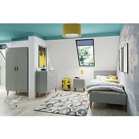 Armadio moderno KUBI grigio su gambe in legno massello di rovere. Con il suo design l'armadio si adatta alle camerette dei bambini arredate in stile scandinavo. È adatto per le camerette dei bambini di qualsiasi età, per ragazzi e ragazze.