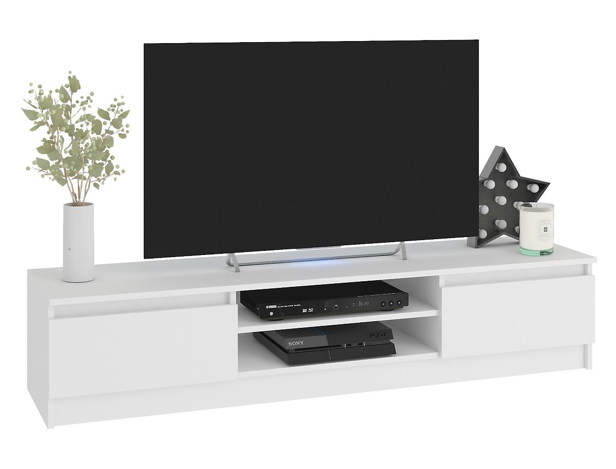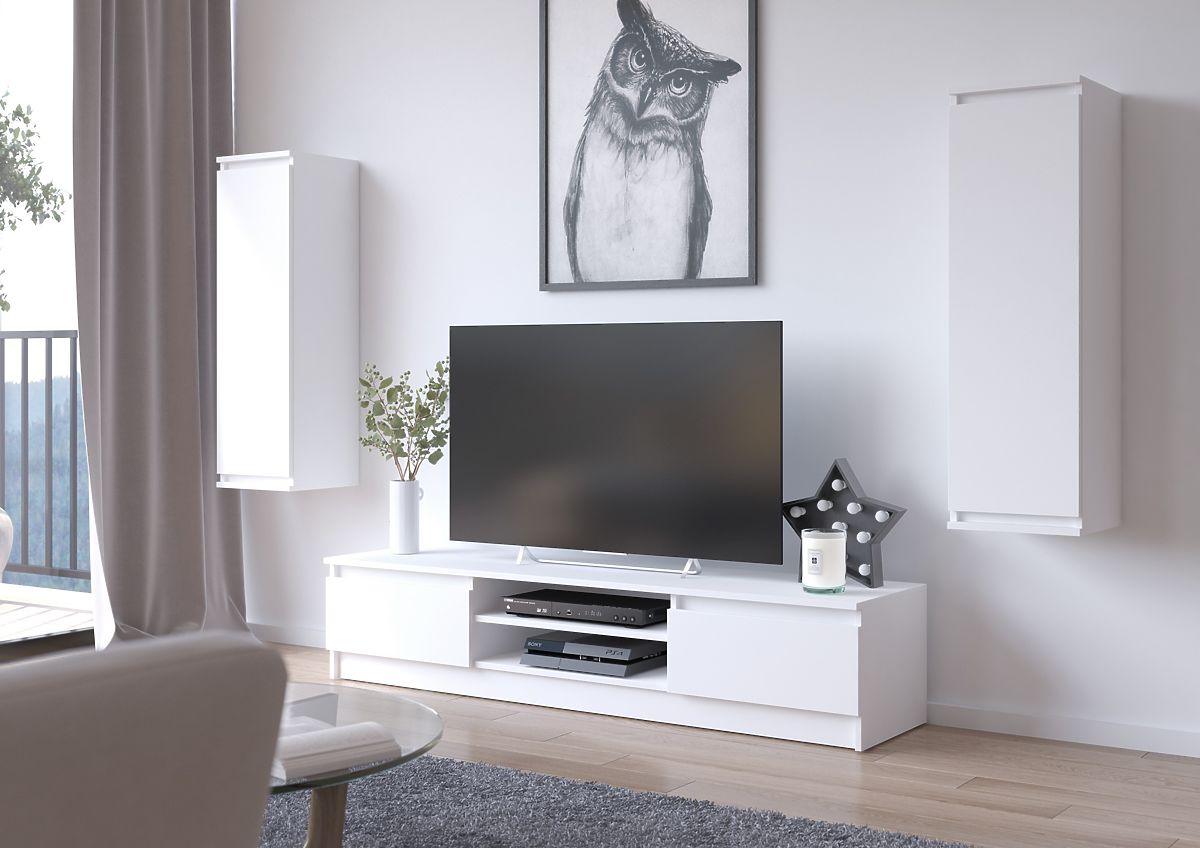 Il mobile TV e gli armadietti sospesi in bianco si adattano perfettamente a un interno moderno. La tonalità del bianco classico è così universale che il set di mobili apparirà efficace sia in una stanza con colori pastello che in un soggiorno con pareti o tappeti in tonalità più scure. I mobili sono realizzati in pannello laminato con bordo ABS, resistente all'abrasione, ai graffi e all'uso prolungato.