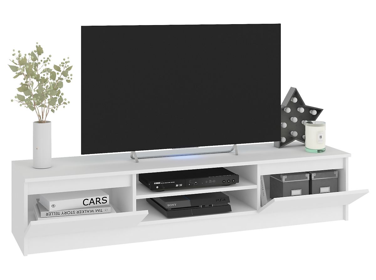 Il set di mobili, composto da un mobile TV e due armadietti sospesi, può essere un arredo funzionale per il soggiorno, lo studio o la camera degli studenti. Il mobile TV ha un ampio piano su cui è possibile posizionare una TV di qualsiasi dimensione e elementi decorativi. I mobili sono dotati di pratici ripiani per l'elettronica e spazi di stoccaggio laterali con ante a ribalta, dove è possibile riporre DVD, accessori per computer o altri piccoli oggetti. Il mobile TV in combinazione con gli armadietti sospesi ai suoi lati crea una composizione visivamente attraente. I mobili occupano poco spazio, il che li rende adatti non solo per un grande soggiorno, ma anche per spazi più piccoli.