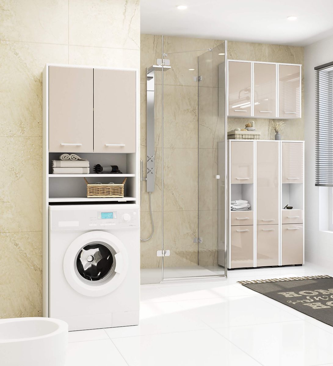 Il modello di pensile da bagno FIN 2D si distingue per una costruzione moderna e funzionale. Il prodotto è realizzato in pannello laminato di alta qualità del produttore Kronospan con uno spessore di 16 mm, resistente a deformazioni e usura. I bordi sono inoltre rivestiti con bordo ABS, che protegge perfettamente dai danni. Le facciate sono realizzate in un effetto colore cappuccino che si armonizza perfettamente con la struttura bianca. L'alta lucentezza del mobile dona spaziosità all'interno, particolarmente apprezzata negli spazi piccoli.