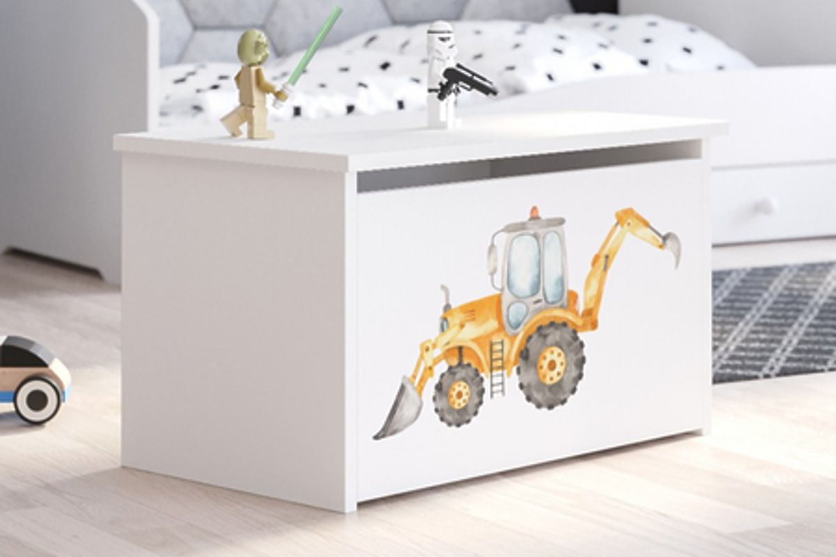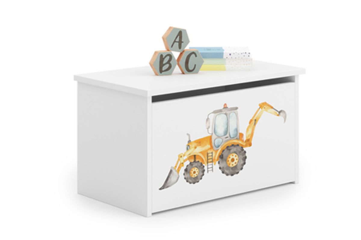 Baule bianco per giocattoli con grafica escavatore giallo. .. altro