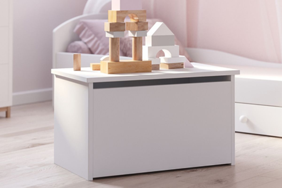 Baule bianco per giocattoli con design moderno e apertura sicura. .. altro