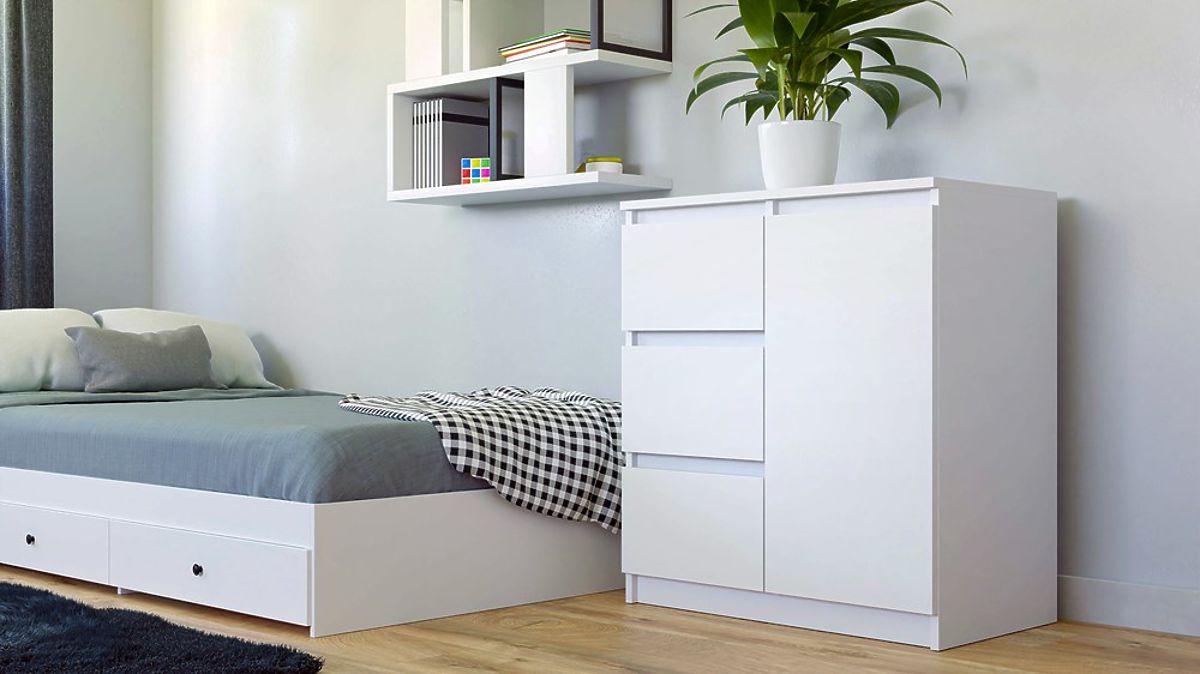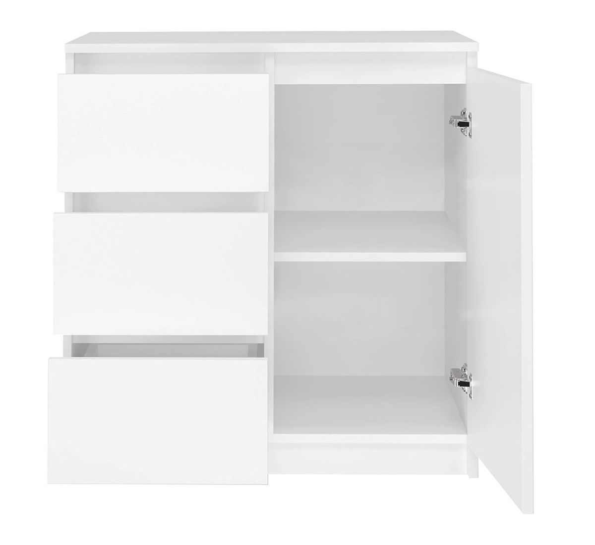 Cassettiera moderna con 1 anta e 3 cassetti in bianco opaco. .. altro
