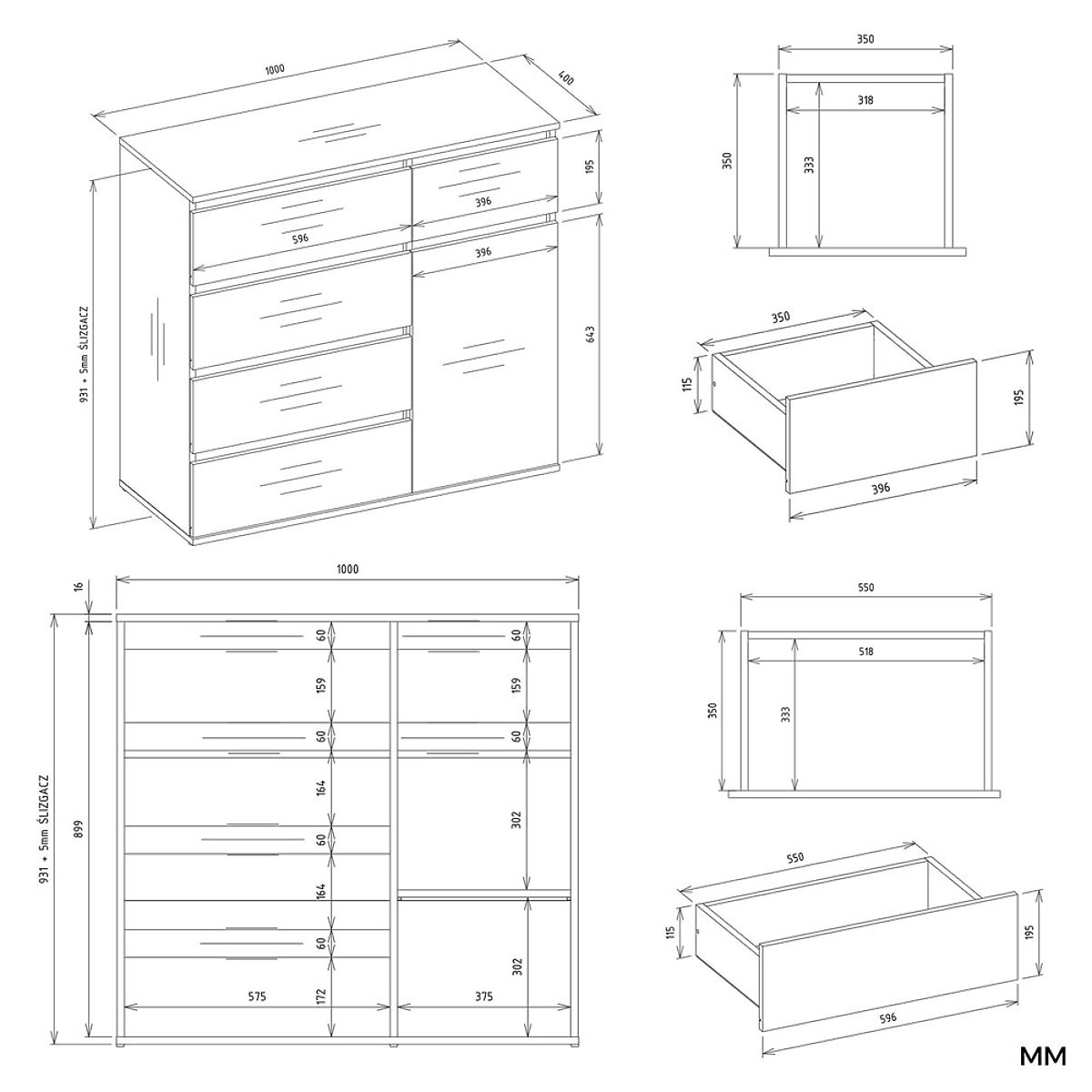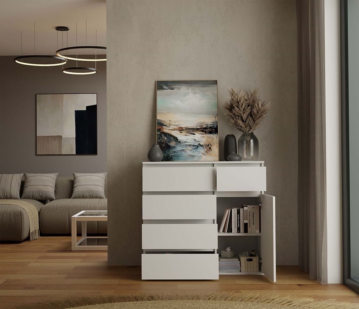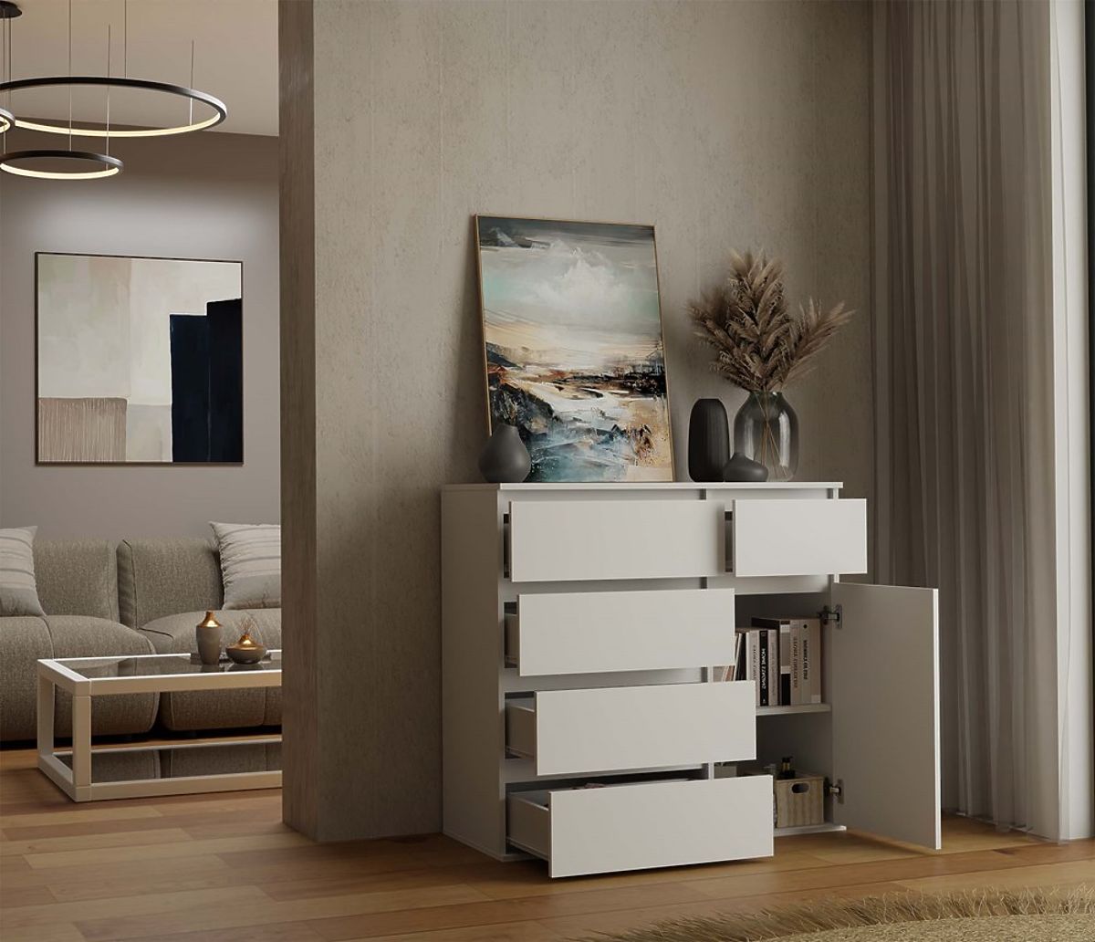 Cassettiera bianca con 1 porta e 5 cassetti spaziosi. .. altro