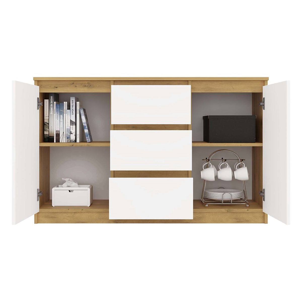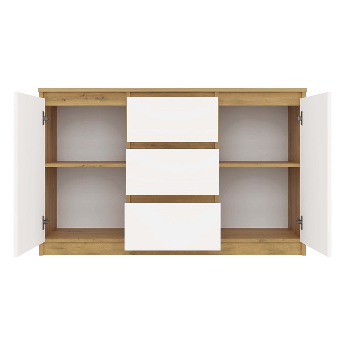 • Combinazione di colori moderna – l'unione della calda tonalità del rovere Artisan con i frontali bianchi conferisce alla cassettiera un aspetto elegante e stiloso.
