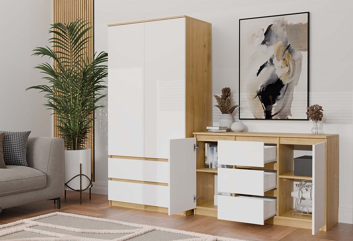 La cassettiera 2D3S è una perfetta combinazione di design moderno e funzionalità. Il design moderno ed elegante, che unisce la calda tonalità del rovere Artisan con il classico frontale bianco, dona un carattere unico all'interno. L'accostamento di questi due colori rende la cassettiera perfetta sia in ambienti moderni che in quelli più tradizionali.
