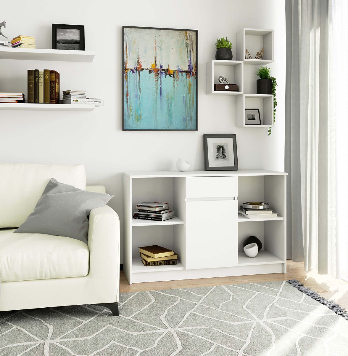Il comò bianco della serie B-17 può servire come elemento indipendente in ogni stanza. Grazie alla struttura modulare, può essere combinato con un altro segmento della serie per creare un comodo tavolo angolare (altri elementi sotto forma di tavolo sono acquistabili nel nostro negozio). La parte centrale del comò contiene un cassetto e una porta chiudibile che permettono uno stoccaggio libero. Inoltre, ha quattro ripiani simmetrici separati con molto spazio per l'esposizione. Il comò, lungo 120 cm e alto 77 cm, è realizzato in pannello laminato. È stato progettato per adattarsi alla maggior parte delle stanze. Può essere un elemento interessante nell'arredamento del soggiorno, fungere da mobile funzionale per lo stoccaggio in camera da letto, ed è adatto anche come segmento aggiuntivo in cucina. Grazie al colore bianco neutro e al design minimalista, diventa un complemento attraente e soprattutto funzionale per ogni interno.