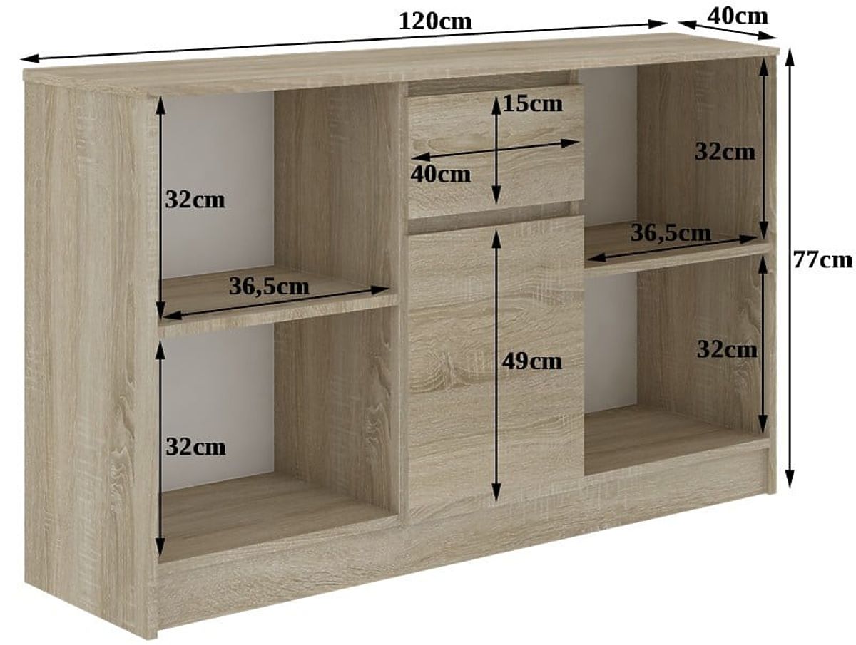 Le dimensioni del mobile sono 120 cm x 77 cm x 40 cm. Invitiamo tutte le persone che cercano un'opzione attraente, di qualità, ma anche conveniente per arredare una stanza, a conoscere meglio questa interessante offerta. Speriamo che soddisfi le aspettative anche delle persone più esigenti. Il comò è composto da due ripiani aperti, uno dietro l'anta e un cassetto. L'insieme si presenta magnificamente sia da solo che in combinazione con altri mobili di questa serie. Vi invitiamo all'acquisto.