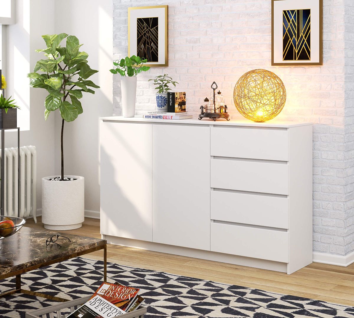 Il comò bianco si distingue anche per il suo alto valore pratico. Infatti, ha 4 cassetti facilmente apribili e 2 ripiani molto grandi. Tale costruzione garantisce comodità nello stoccaggio ed è una soluzione molto funzionale. Nel comò puoi riporre tutte le cose necessarie e averle sempre in un unico posto, a portata di mano.
