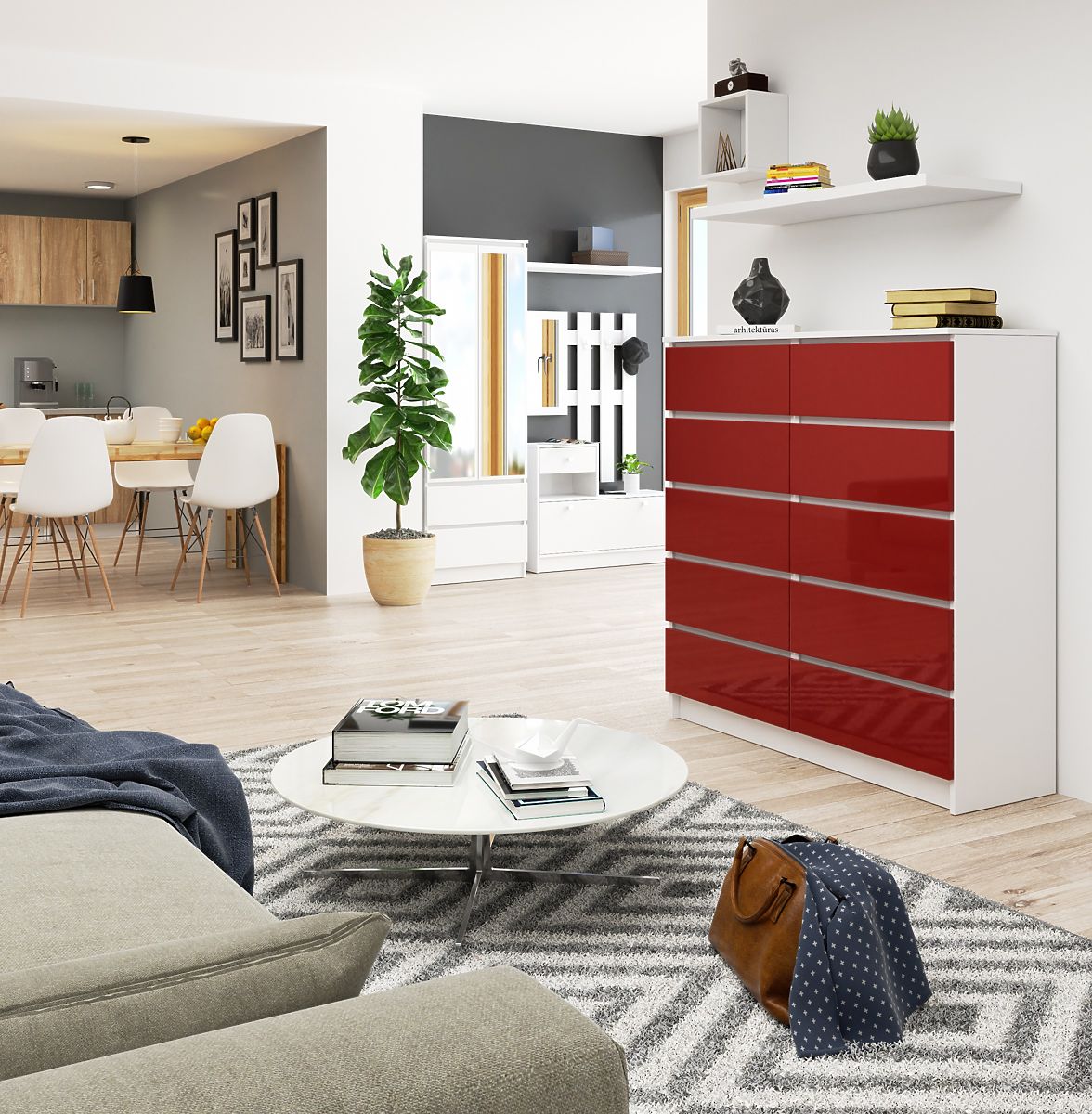 Il comò bianco / rosso lucido è un mobile che si abbina bene con sfondi bianchi, blu navy, grigi e cappuccino, ma i più audaci possono combinarlo con arancione energetico, verde bottiglia o viola intenso. Il mobile si adatta perfettamente al soggiorno, ai laboratori di sartoria e artigianato, agli uffici moderni arredati in uno stile audace con charme. Può essere integrato con successo anche in arredamenti classici.
