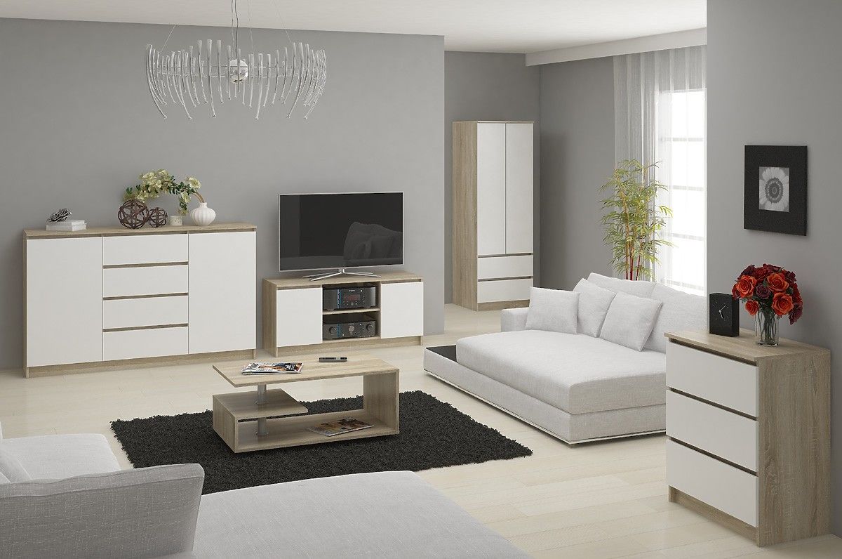 Elegante, stiloso e moderno. Questi tre aggettivi descrivono il nostro comò. Rifinito in colori senza tempo. Il corpo è in colore rovere sonoma, mentre i frontali dei cassetti sono bianchi. L'offerta che proponiamo ai nostri clienti ha una lunghezza di 120 centimetri, un'altezza di 77 centimetri e una profondità di 40 centimetri. Proprio quest'ultima dimensione rende il nostro mobile così spazioso. Naturalmente, anche i sei cassetti per vari accessori, vestiti e scarpe giocano un ruolo importante. I cassetti già menzionati si muovono dolcemente e precisamente, tutto grazie alle guide a sfera in metallo.