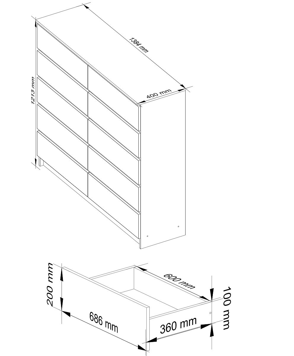 Comò bianco in stile minimalista, perfetto sia per interni moderni che per spazi più piccoli che necessitano di illuminazione e ampliamento ottico. Sarà uno spazio di archiviazione pratico - ha dieci cassetti spaziosi che ti aiuteranno a mantenere l'ordine in casa. Si adatta perfettamente al soggiorno, allo studio o a un corridoio stretto.