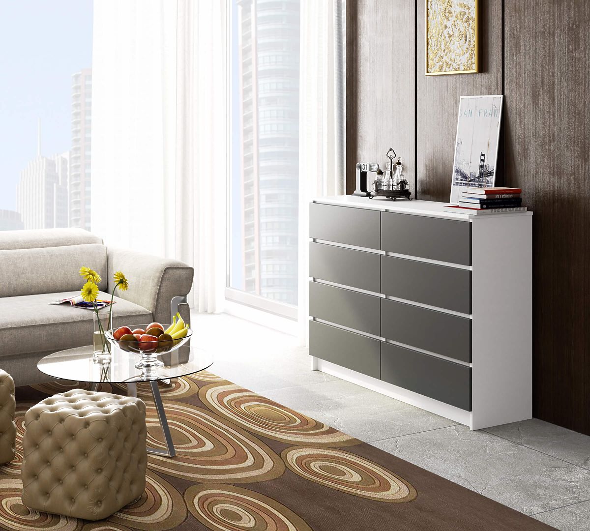 Comò in pannello laminato con 8 cassetti, bianco e grigio. .. altro