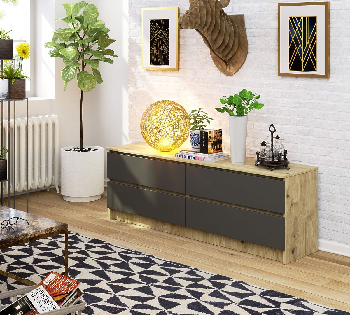Comò in rovere Artisan con 4 cassetti e frontale grigio. .. altro