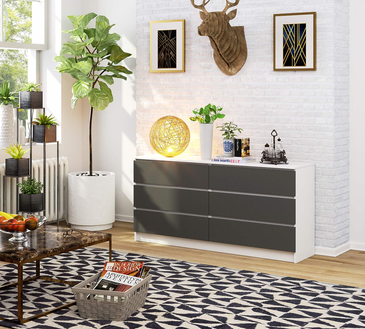 Il comò è un mobile talmente versatile che può essere utilizzato in qualsiasi stanza. Si trova più spesso nei soggiorni, nelle camere dei bambini, nelle camere da letto, nelle sale da pranzo o negli uffici. Il comò dovrebbe armonizzarsi con gli altri mobili dell'arredamento e allo stesso tempo distinguersi per la lavorazione solida e accurata e la funzionalità. Il prodotto presentato K 160 cm è un modello moderno mantenuto in una tonalità senza tempo. La combinazione di bianco e grigio grafite senza dubbio attirerà coloro che preferiscono uno stile minimalista e interni arredati in stile scandinavo. Il comò è dotato di sei cassetti spaziosi. Si apre e si chiude facilmente. Trova applicazione sia in spazi residenziali che in uffici.