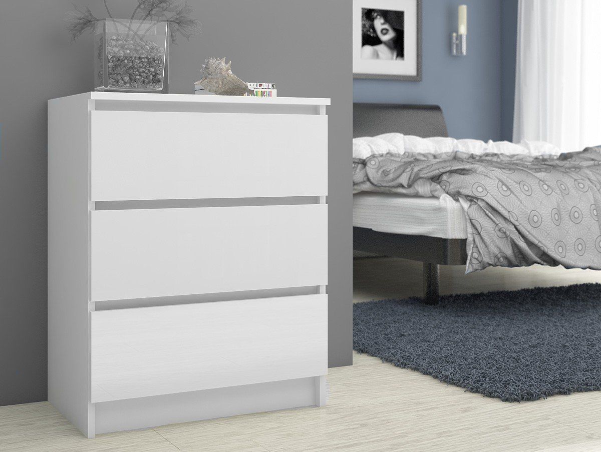 La bellezza sta nella semplicità, e ne siamo ben consapevoli, per questo vi offriamo i mobili da camera più belli. Una delle nostre proposte è un elegante comò bianco da 60 cm, che sicuramente piacerà agli amanti dello stile scandinavo. I mobili bianchi sono molto popolari ultimamente - non c'è da meravigliarsi: combinano praticità, versatilità e un aspetto attraente. Il comò bianco con 3 cassetti è una proposta che si adatta perfettamente a soggiorni, camere da letto, camere per bambini e ospiti, sale da pranzo e molte altre stanze. Può essere utilizzato con successo anche in ufficio. Tre pratici cassetti possono facilmente contenere tutti gli oggetti necessari. Il comò è realizzato in pannello laminato da 16 mm, caratterizzato da una maggiore resistenza all'abrasione. I bordi sono rivestiti con bordo ABS. Vi consigliamo di approfittare della nostra offerta.