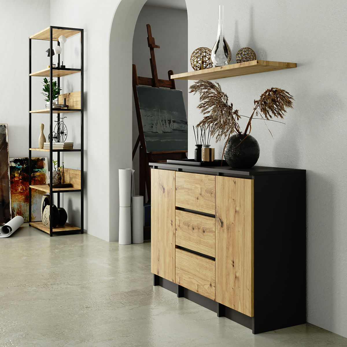 Credenza in grafite grigio e rovere artigiano con 3 cassetti e 2 ante. .. altro