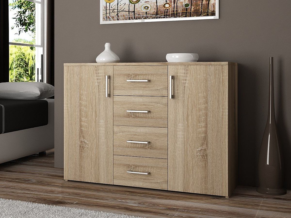 Credenza per soggiorno, camera da letto o anche ingresso, realizzata in pannello laminato resistente all'abrasione. La posizione dipende dalle preferenze dell'utente e dal completamento dell'arredamento. In questa offerta consigliamo il modello nel colore Rovere Sonoma. La tonalità chiara soddisferà le aspettative di tutti i proprietari di interni chiari, spaziosi e moderni. La credenza è interamente realizzata in pannello laminato di spessore 16 millimetri. Ciò garantisce una lunga durata e senza problemi!