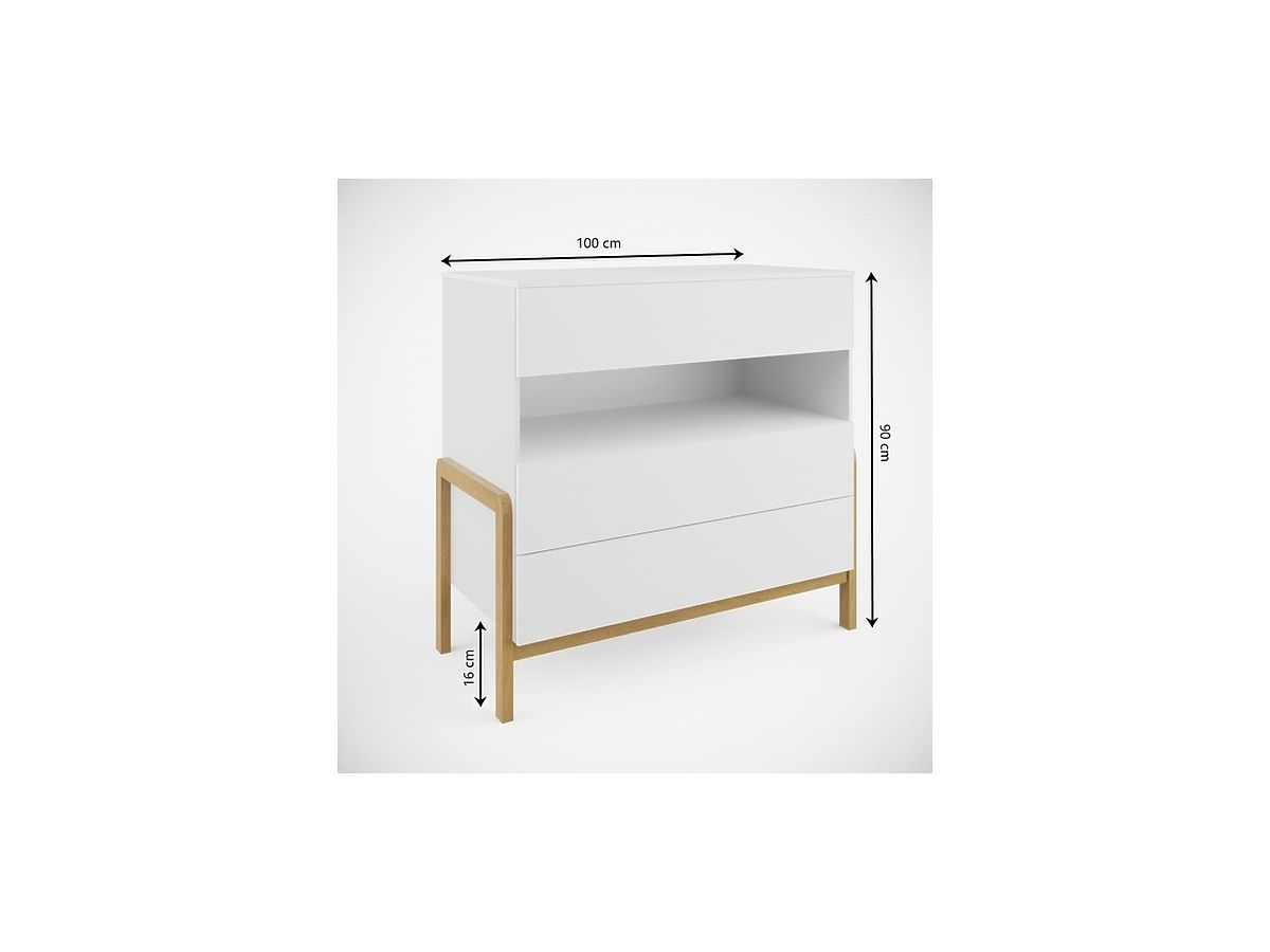 Cassettiera bianca in stile scandinavo con tre spaziosi cassetti e uno spazio aperto. .. altro