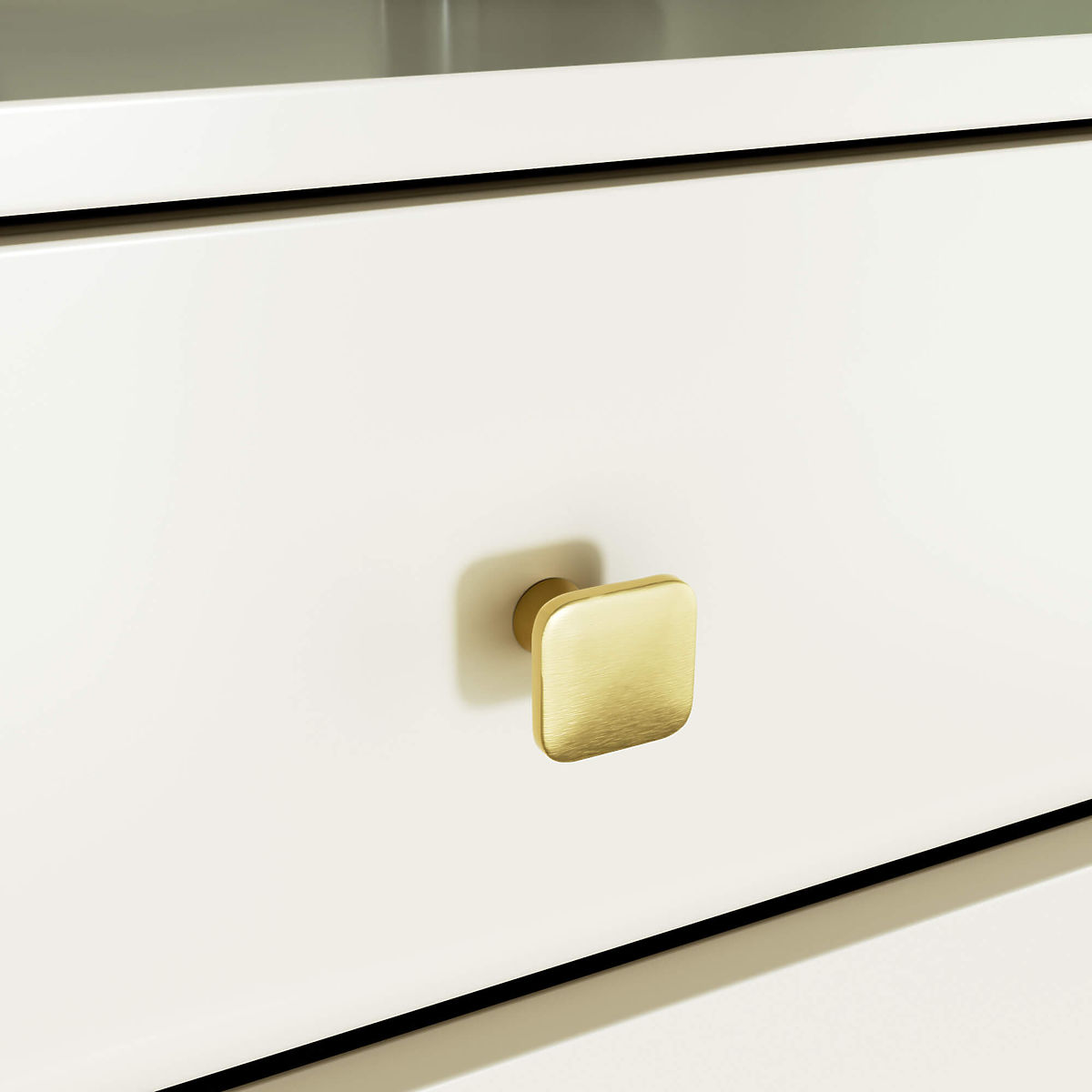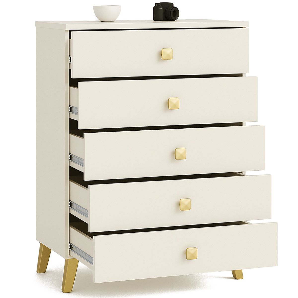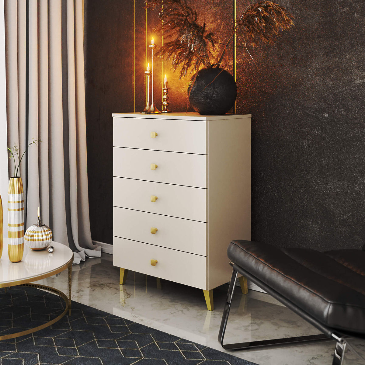 La piccola credenza è un elemento d'arredo che trova impiego in ogni stanza. I colori moderni, la struttura solida e la lavorazione accurata hanno portato alla creazione di un mobile adatto, ad esempio, all'ingresso, al soggiorno o alla camera dei bambini, ma anche alla camera da letto. Può essere utilizzata anche in uffici, dove permette di riporre numerosi documenti e altri articoli per ufficio. La credenza è composta da 5 cassetti. Il mobile combina i colori cashmere e oro.