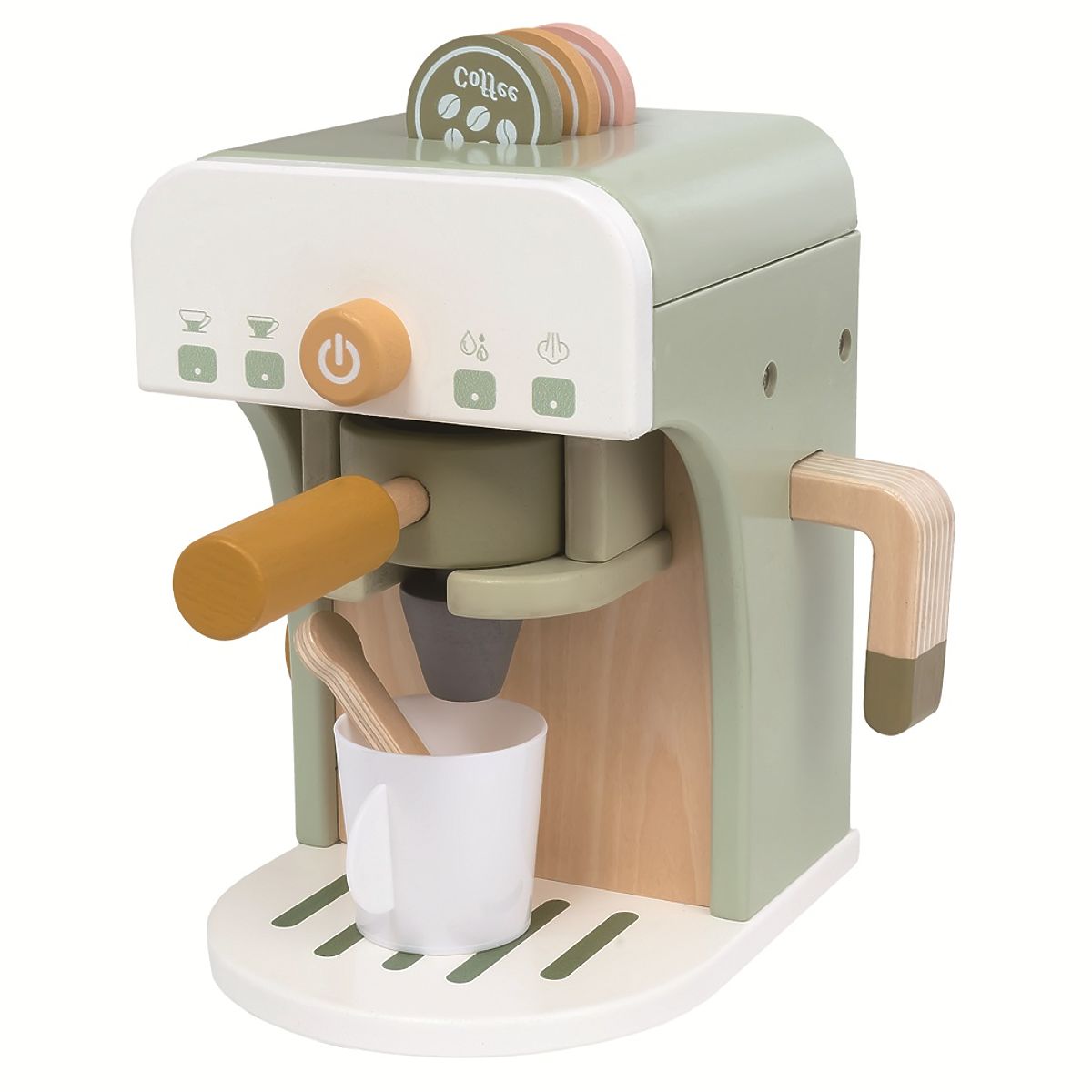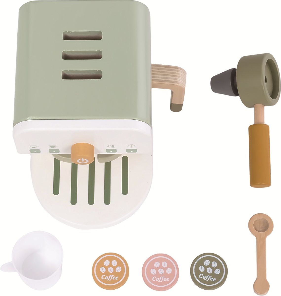 Set di macchina da caffè con accessori per tutti i piccoli baristi e future amanti del caffè. Preferisci un espresso o un cappuccino? La macchina da caffè a leva in legno con dettagli realistici include tre capsule intercambiabili, una tazza, un cucchiaino e naturalmente una leva per il caffè che può essere inserita direttamente nella macchina. I bambini possono riporre le capsule negli appositi spazi sulla parte superiore della macchina. Il giocattolo stimola il gioco immaginativo, sviluppa la motricità fine, la coordinazione dei movimenti e le abilità sociali. I bambini possono giocare da soli o servire gli ospiti nel loro caffè personale. Le piacevoli tonalità pastello e terrose insieme al legno naturale di qualità rendono questo giocattolo un bellissimo complemento per ogni cameretta. Contenuto della confezione: macchina da caffè, leva per il caffè, 3 capsule, tazza, cucchiaino. Principali caratteristiche: macchina da caffè a leva con accessori, design realistico e dettagli funzionali, stimola il gioco immaginativo, sviluppa la motricità fine e la coordinazione, legno naturale combinato con tonalità terrose, complemento ideale per la cucina dei bambini, adatto per bambini dai 2 anni in su.