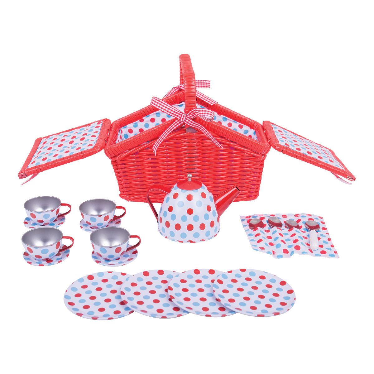 Questo splendido set da tè a pois include un cesto di vimini rosso, che contiene quattro tazze, quattro piattini, una teiera con coperchio rimovibile e quattro cucchiaini in una custodia. Il set include tutto ciò di cui i bambini hanno bisogno per un tè pomeridiano. Principali caratteristiche: adatto anche per i viaggi, un ottimo modo per stimolare la creatività e le idee, conforme alle attuali norme di sicurezza europee.