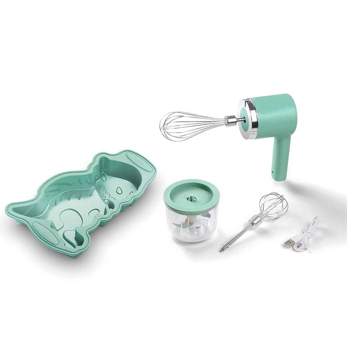I vostri bambini amano passare il tempo in cucina e vogliono essere indipendenti? Con questo set 3 in 1 possono farlo. Il set di strumenti per la cottura è perfetto per i piccoli chef. Include un frullino a mano, un tritatutto e uno stampo in silicone per la cottura. Ogni elemento di questo set è stato progettato con enfasi sulla praticità e facilità d'uso. Il frullino e il tritatutto sono leggeri, quindi i bambini possono maneggiarli facilmente. Il frullino a mano a batteria con 2 accessori ha 5 velocità. Tritatutto con capacità di 300 ml. Lo stampo in silicone a forma di dinosauro è antiaderente e flessibile. Resiste a temperature estreme: fino a 230°C e -40°C, quindi è adatto per il forno e anche, ad esempio, per il congelatore. Le dimensioni dello stampo sono 27x17x6 cm, capacità 950 ml. Senza BPA. Ricarica semplice tramite cavo USB. Il cavo USB è incluso nella confezione. Questo apparecchio può essere utilizzato dai bambini se sotto la supervisione di un adulto o se sono stati istruiti sull'uso sicuro dell'apparecchio e comprendono i potenziali pericoli. Caratteristiche principali: 3 in 1 in uno facilita la preparazione di vari piatti ottimo aiuto in cucina