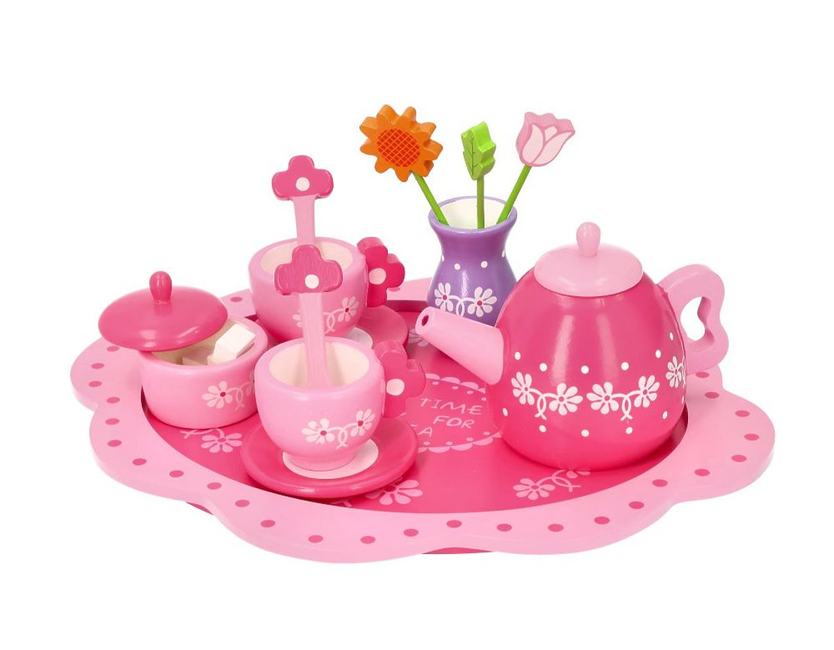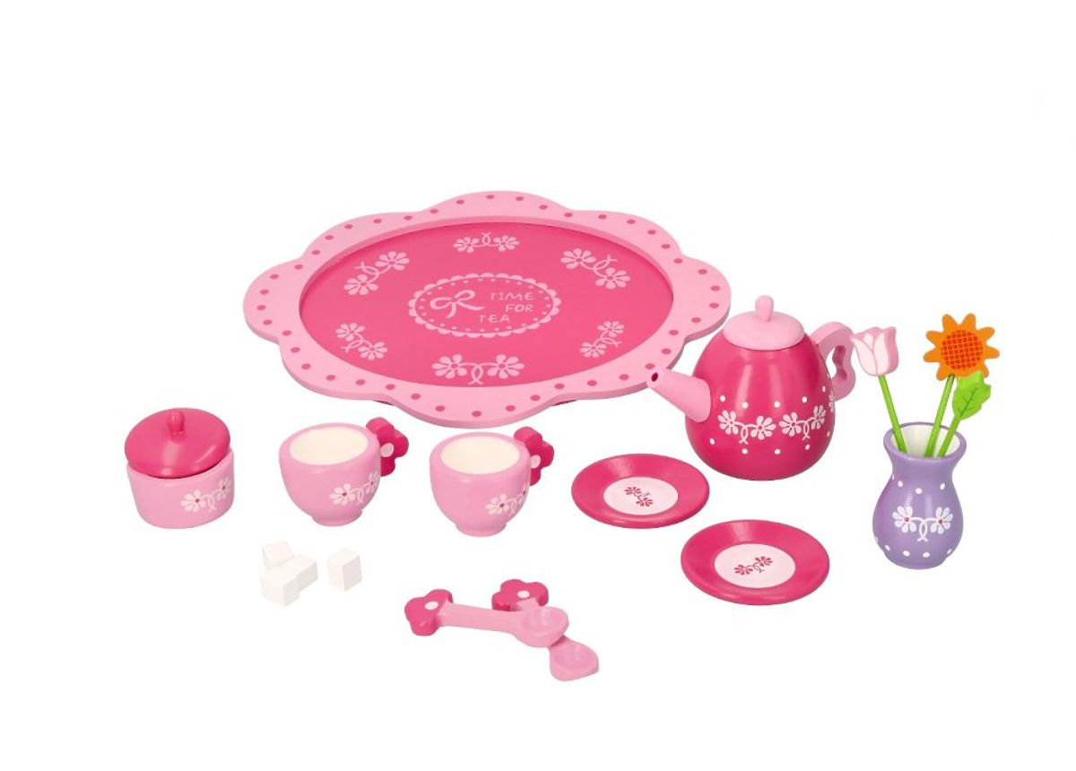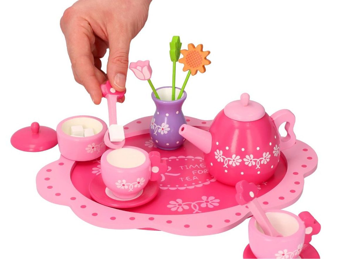 Il fantastico set da tè in legno offrirà ai bambini molte ore di divertimento straordinario. Il set da tè è perfetto per un picnic all'aria aperta, ma anche per giocare nella stanza di una piccola signora. I cubetti di zucchero nella zuccheriera, le tazze e la teiera faranno sentire ogni bambina come una vera signora che organizza un ricevimento. L'intero set può essere facilmente trasportato su un vassoio di legno.
