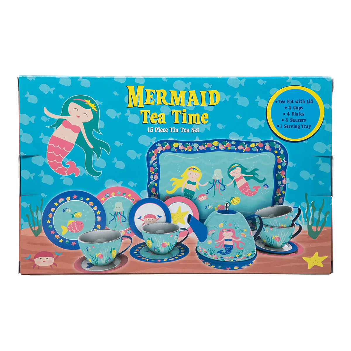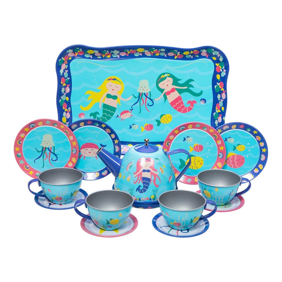È l'ora del tè. Splendido set da tè di 15 pezzi realizzato in metallo, include 4 tazze con piattini, 4 piattini da dessert, una teiera con coperchio e un vassoio da portata, tutto con design di sirene. La creatività aumenta quando i vostri piccoli ospitano amici, bambole e peluche con questo bellissimo set da tè. Adatto per piccoli ospiti e ospitanti dai 3 anni in su. Caratteristiche principali: Set da tè di 15 pezzi ideale per giochi di finzione con il tè design con tema delle sirene