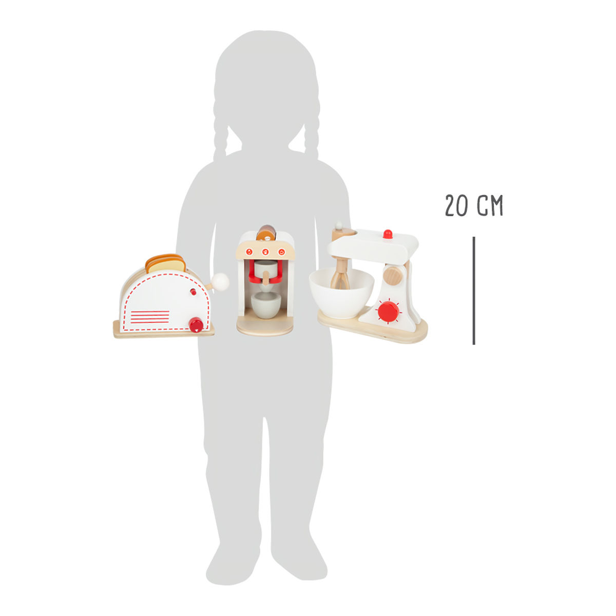 Set completo di popolari elettrodomestici da cucina! Questo set offre un tostapane, una macchina da caffè e un frullatore, tutto ciò di cui ogni cucina ha bisogno. Gli elettrodomestici in legno incoraggiano i bambini a giocare di ruolo e sono molto realistici. Hanno manopole a scatto, il tostapane ha anche una leva per "sparare" i toast tostati, la frusta del frullatore ruota. La macchina da caffè ha chicchi di caffè di diversa intensità, così puoi preparare espresso, cappuccino o latte. Principali caratteristiche: frullatore con ciotola, tostapane con 2 toast, macchina da caffè con leva e 4 capsule, tazza, componenti funzionali, rimovibili e mobili, manopole rotanti a scatto, struttura robusta e resistente in legno