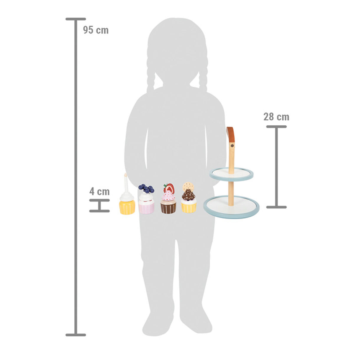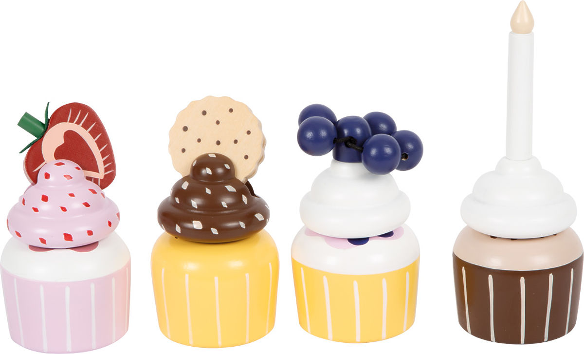Delizie per la cucina dei bambini. Questo supporto con quattro pirottini invita i piccoli pasticceri a giocare attivamente e a presentare deliziosi muffin. Il supporto ha due livelli che servono per esporre i dolci a strati. Il sistema di basi e coperture combinabili offre ampie possibilità di combinazioni. I singoli pezzi sono tenuti insieme da magneti integrati. Il set è completato da un biscotto doppio, una fetta di fragola, mirtilli e una candela di compleanno per decorare le torte. Questo stimola l'appetito per il tè con bambole, orsacchiotti, ecc. Chi non ha l'acquolina in bocca a questa vista? Un accessorio ideale per la cucina e il negozio di alimentari. Dettagli come la maniglia in finta pelle marrone scuro, i magneti integrati e i colori scandinavi moderni e discreti rendono il supporto un'attrazione di alta qualità e stile per la cameretta dei bambini. Caratteristiche principali: colori scandinavi discreti che ispirano e stimolano la conversazione, 1 supporto, 4 muffin, 4 coperture, 1 candela, 1 biscotto, 1 fragola, 1 mirtillo
